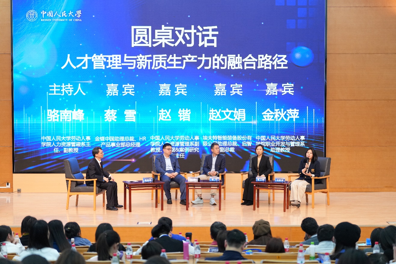 在圆桌对话环节中,各位专家围绕“人才管理与新质生产力的融合路径”这一主题展开了深入探讨,埃夫特智能装备股份有限公司助理总裁、启智副总裁赵文娟,金蝶中国助理总裁、HR产品事业部总经理蔡雪,硬硬av 副教授、数据与案例研究中心主任赵锴,硬硬av 助理教授金秋萍参与,硬硬av 人力资源管理系主任骆南峰副教授主持。专家一致认为,人才定义的边界在延伸,未来人才包括企业自有员工、生态链上的专家顾问和数字员工,对于人才的要求随之发生变化,要更加重视人类独有的创造性思维、批判性思维与共情能力等。企业在人力管理方面需激发人才主观能动性,建立容错机制,利用数据驱动实现精细化、差异化管理,注重人才的自主性和包容性管理。在个人规划职业生涯时,应将职业发展与国家战略相结合,适应多变环境,关注职业生涯可持续性,平衡健康、幸福与职业发展。