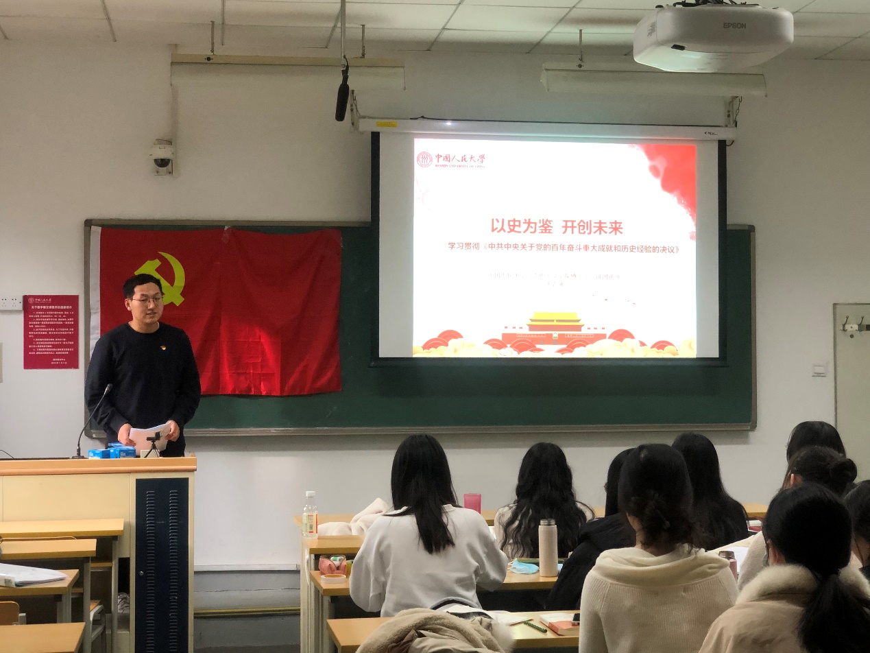 马克思主义学院博士宣讲团讲师张志强以《以史为鉴,开创未来——学习贯彻<中共中央关于党的百年奋斗重大成就和历史经验的决议>》为题,分析了《决议》在党的历史上的重要地位,阐释了党的三个历史决议间一脉相承又与时俱进的关系,并从起草过程、深刻内涵、创新观点、重要论断等方面解读了《决议》主要内容。通过讲师张志强的讲解,支部成员对《决议》有了更深刻的认识与理解。