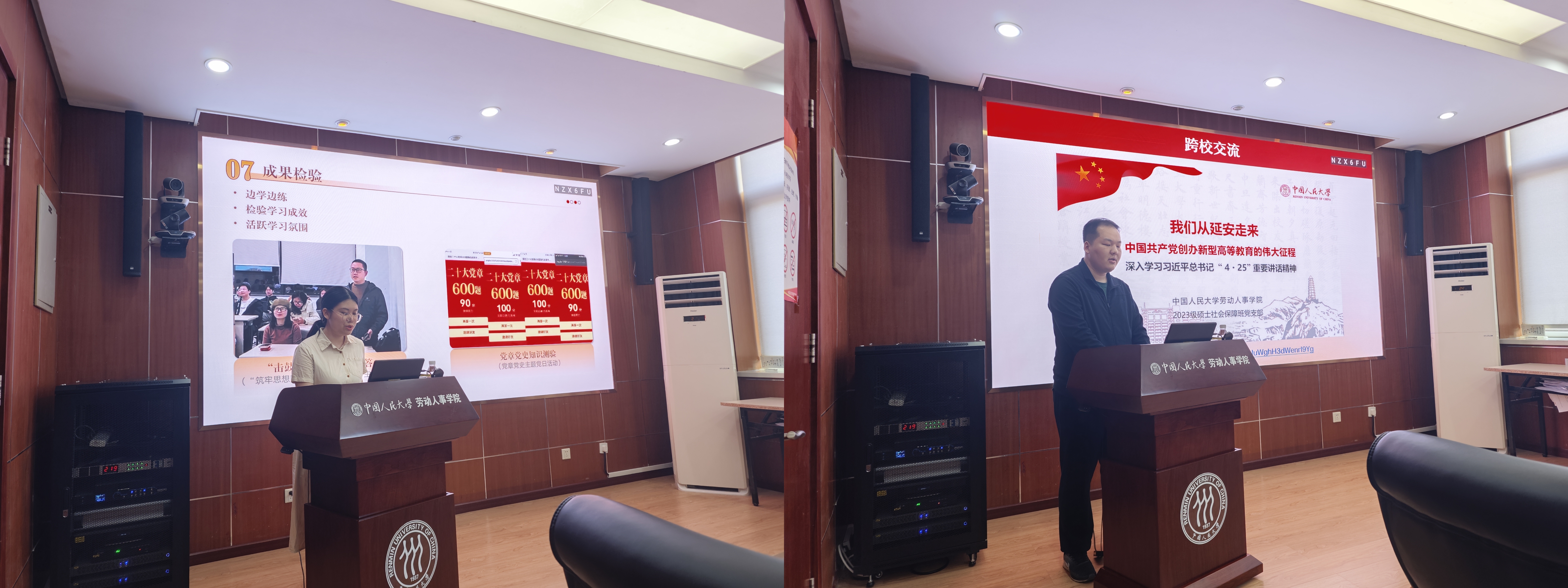 首先,三位分别来自本硕博学生党支部的支委代表做主题分享。本科第四党支部纪检委员朱一雄分享了在学生党支部中做好纪检工作要坚持严管和厚爱相结合,将可能出现的问题在萌芽阶段扼杀。2023级硕士社会保障班党支部书记龚睿翔分享了基层学生支部党纪联学创新活动,以联合五院九支部开展的“延河宣讲明党纪,五院联学树新风”活动为例。2022级博士班党支部书记刘鹏分享了支部党纪教育的“三步走”思路,即对比新旧条例学习新方向、逐字学习分块理解、结合自身经验学党纪。
