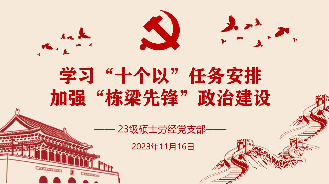 2023年11月16日19:00,2023级硕士劳动经济班党支部在立德公寓226室开展“学习‘十个以’任务安排,加强‘栋梁先锋’政治建设”主题党日活动。本次活动由2023级硕士劳动经济班党支部纪检委员仪晓青主持,2023级硕士劳动经济班党支部党员及入党积极分子共同参加。