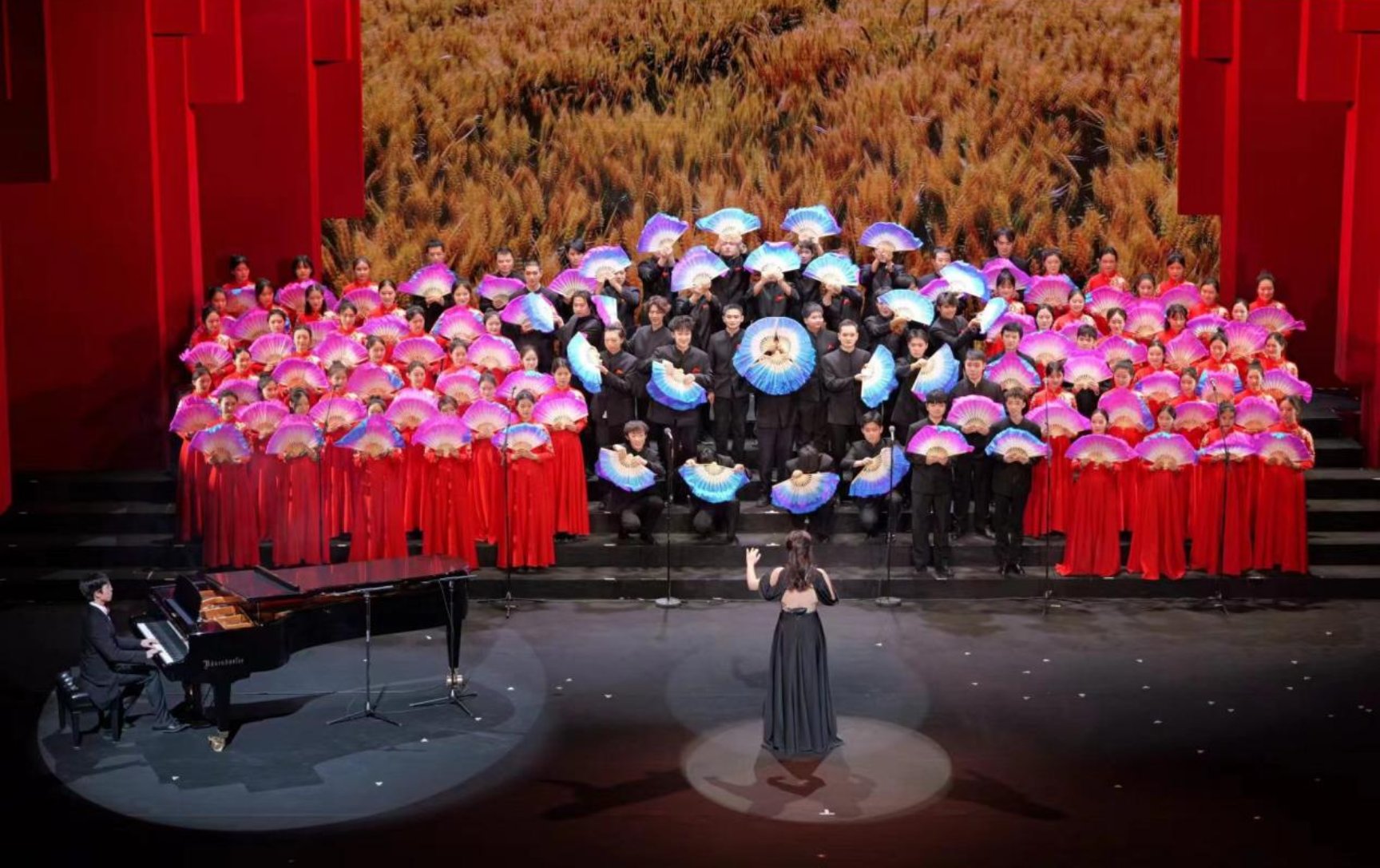 15:00,灯光骤暗,观众呐喊,由硬硬av 各级学生代表与硬硬av 五位老师组成代表队、由2023级硕士研究生刘奕池担任本次指挥,由2021级本科生邓天健负责钢琴伴奏,硬硬av 代表队以最饱满的精神风貌登上舞台,以《南泥湾》唱响明德舞台,以手中扇挥舞陕北江南。乐章如诉,扇花开遍,红蓝翻飞;劳人学子用歌声讲述那段佳话,用手中彩扇绘就希望之画;垦荒南泥湾的光辉岁月在天边、在眼前、在我们每个人的心中。