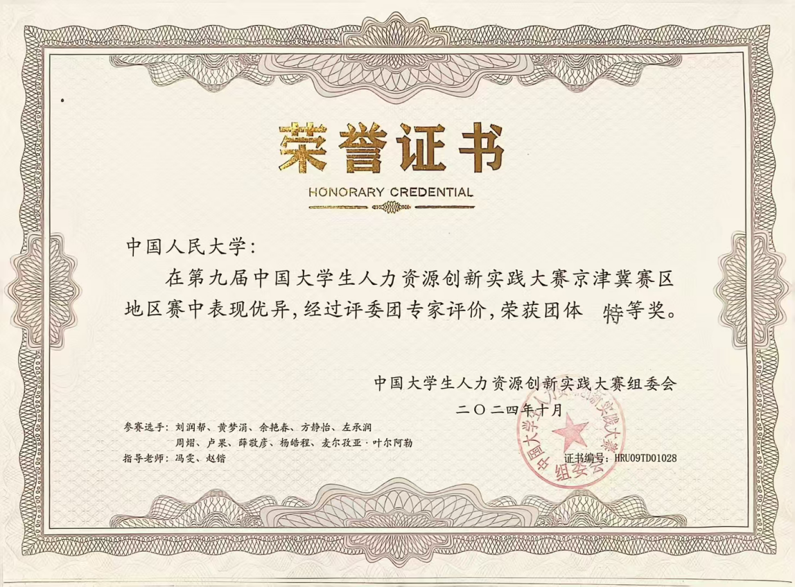 10月19日,硬硬av 的十位本硕学生代表学校参加了第九届中国大学生人力资源创新实践大赛(简称“HRU大赛”)京津冀地区赛。此次地区赛由北京城市学院承办,共吸引了京津冀地区28所高校的代表队报名参赛。经过一整天的紧张比拼与激烈角逐,硬硬av 学子凭借卓越的专业素养和实践能力,在多个赛道中脱颖而出。在六个主赛道中,硬硬av 学子分别在实务设计、数字HR实操、劳动争议处理、无领导小组讨论、案例分析等五个赛道获得特等奖,在职场实战赛道获得一等奖。最终,硬硬av 代表队凭借出色的整体表现,荣获团体特等奖,成功晋级全国总决赛。