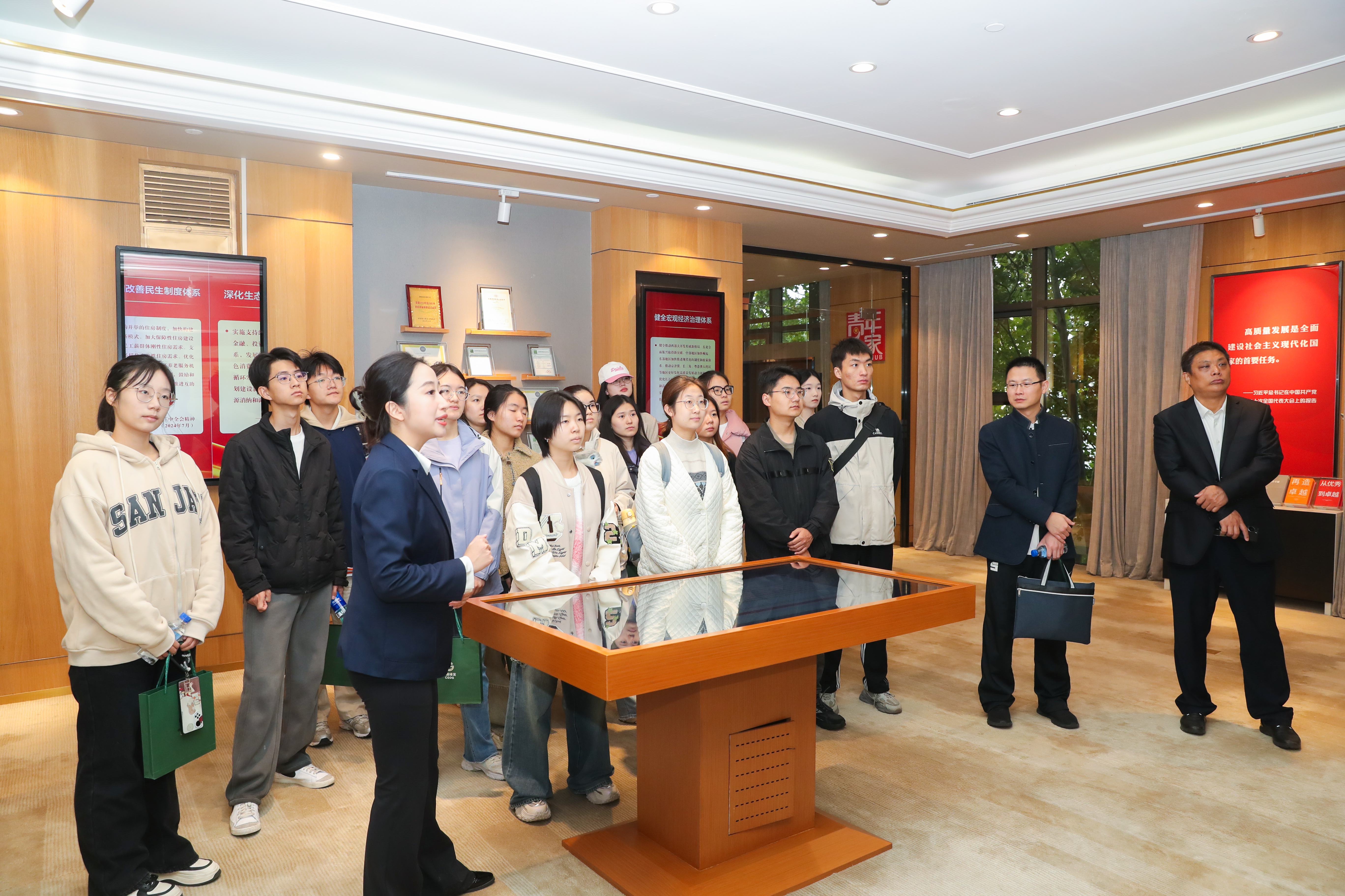 硬硬av 师生首先参观了绿色发展展厅,深入了解中国绿发推动绿色低碳高质量发展的实践成果,见证了集团作为央企的责任担当,以及推进绿色发展、建设美丽中国的坚定决心。在党员政治生活馆,大家参观了党性教育厅、理论实践厅、党建指挥中心以及新中国史教育环廊等区域,全面了解绿发集团以高质量党建引领保障高质量发展的生动实践。在幸福产业党建云领航区,同学们详细了解幸福产业的业务板块和发展愿景,深切感受到幸福产业以高质量产品和优质服务满足人民对美好生活需要的决心和行动。