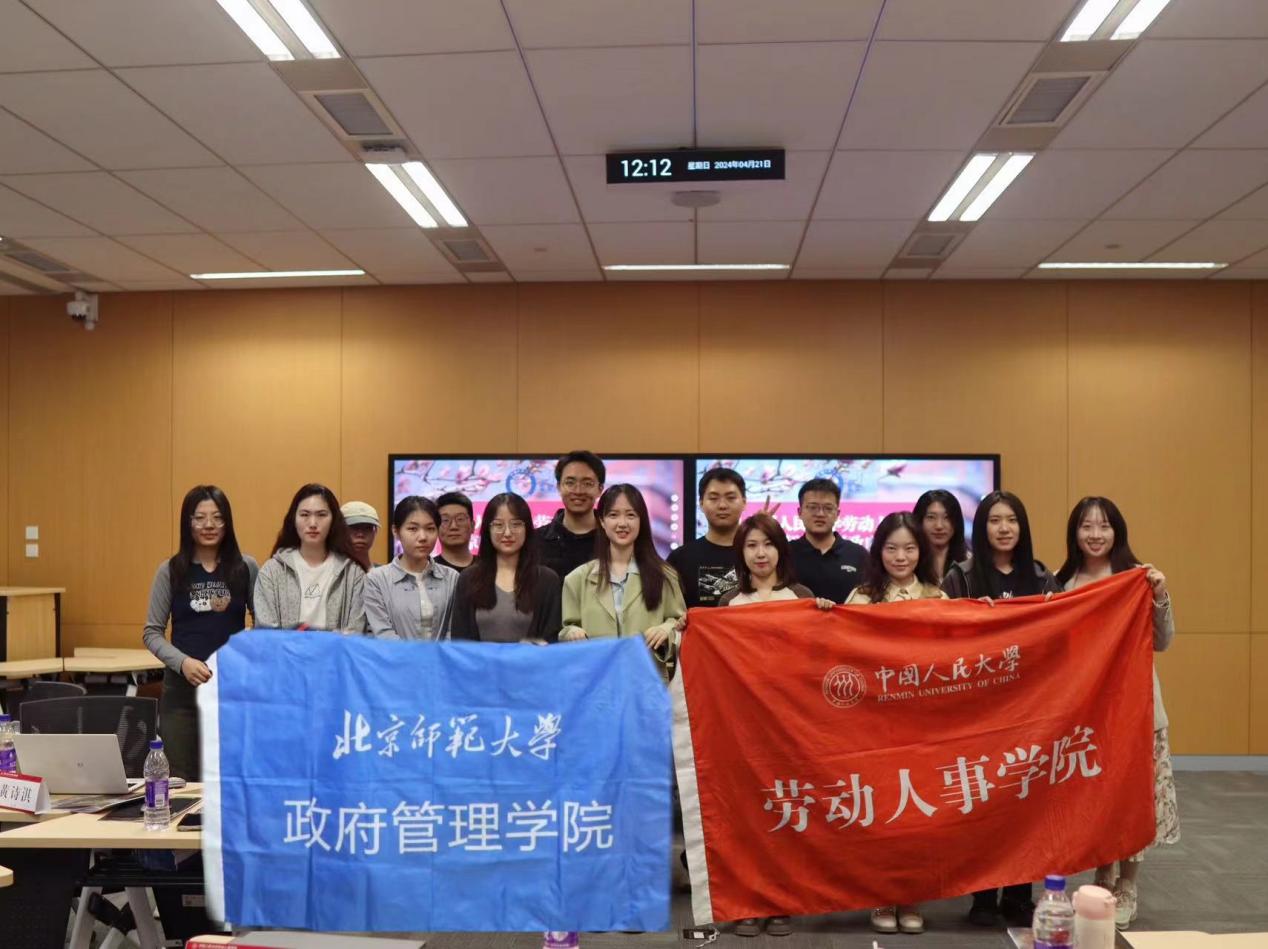 4月21日上午,座谈交流活动在立德楼311教室举办。活动伊始,硬硬av 发展规划部代表石冰玉主持座谈交流,并介绍了人大劳人院与会成员。硬硬av 研究生会主席团成员边辰代表人大劳人院对来访的北京师范大学政府管理学院研究生会和学生代表的来访表示热烈欢迎,他首先介绍了劳人院的基本情况、建院历史、学院特色并且也分享了研究生会基本情况,表明劳人院研究生会始终坚持在党、团委指导下,始终将促进学院学风建设、服务同学作为宗旨,开展过众多丰富多彩的活动,希望同北师大政管院研会共同分享彼此学生工作经验,为促进两院学生组织合作、研会自身发展以及推动学风建设更上一层楼。北京师范大学政府管理学院研究生会主席团成员韩怡然代表北师大政管院对人大劳人院的热烈欢迎表示感谢,同时介绍了前来参访交流的与会成员,并代表致辞,介绍了北师大政管院的基本情况、学院特色等,并分享了北师大政管院研会的发展情况,最后表示希望通过本次联学交流活动,能够同人大劳人院研究生会建立深厚联系,推动两院未来开展更多形式的合作交流活动。