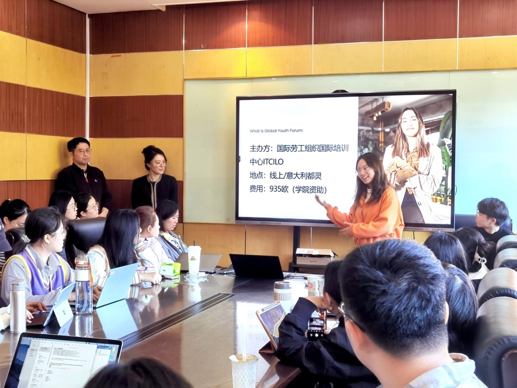 学院本科生杨启晗、徐琳雁和董春颖分别对联合国国际劳工组织国际培训中心冬季论坛项目、罗格斯大学学术前沿夏令营项目以及蒙特利尔大学暑期学校项目进行宣讲,三位同学就项目体验、申请要求等进行了全面细致的介绍。