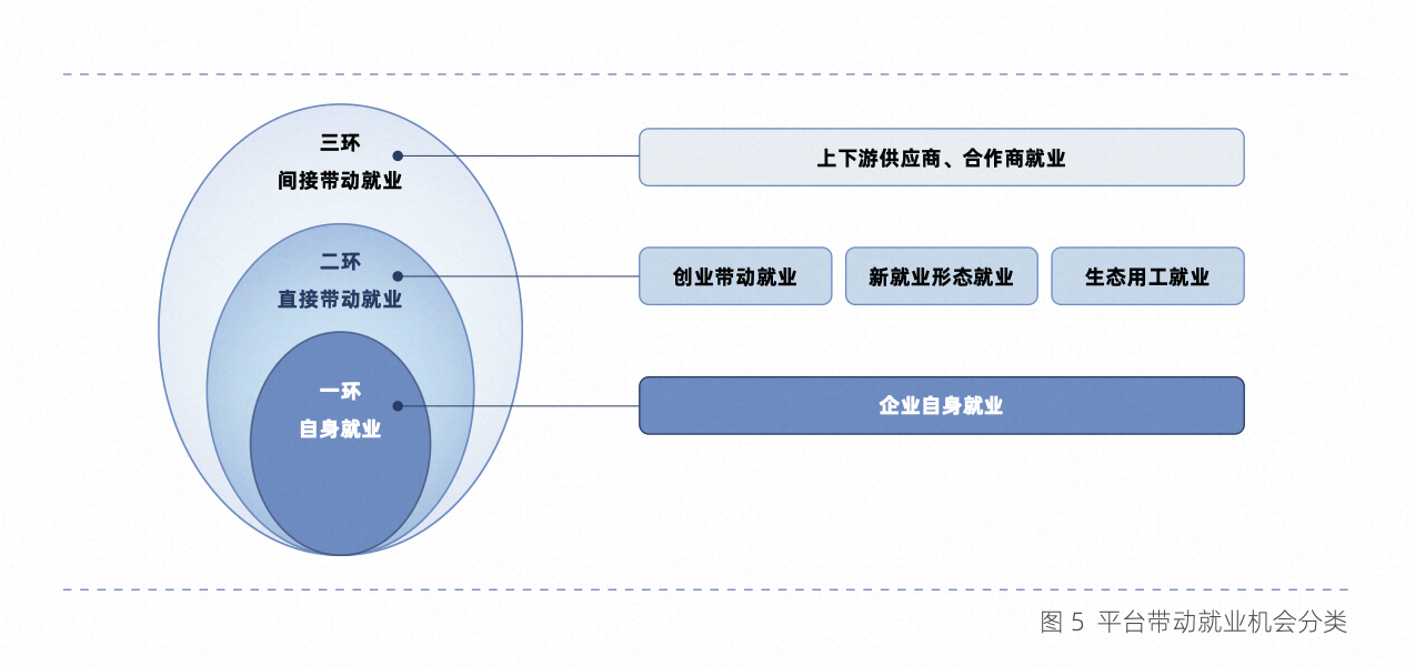 根据平台的具体业务场景,本报告做了更科学的测算。对于一项经济活动带动就业机会的分类,主要根据就业者的收入与该项经济活动的密切程度来划分。考虑到平台经济活动的特性,以及平台就业价值的衡量特点,在本报告中,我们根据就业者收入与平台经济活动的密切程度,将平台带动的就业机会分为三类(如图所示),分别为自身就业机会、直接带动就业机会以及间接带动就业机会。其中,自身就业机会主要是指平台自身的正式员工,他们工作的主要目标是为了搭建平台以及维持平台经济活动的正常运转;直接带动就业机会主要是平台核心业务或经济活动所直接带动的创业/就业机会,其收入直接来自于平台的核心业务/经济活动,例如在平台上销售商品或服务的中小微商家创业及其带动的就业机会,以及以骑手、网约车司机、主播等为代表的新就业形态从业者,以及其他生态用工就业等等;间接带动就业机会是指,依附于平台核心业务的相关经济活动所间接带动的创业/就业机会,其收入与平台的核心业务存在上下游关联关系,例如平台核心业务的上下游供应商所蕴含的创业/就业机会,以及服务于新就业形态从业者的服务商创业/就业机会。