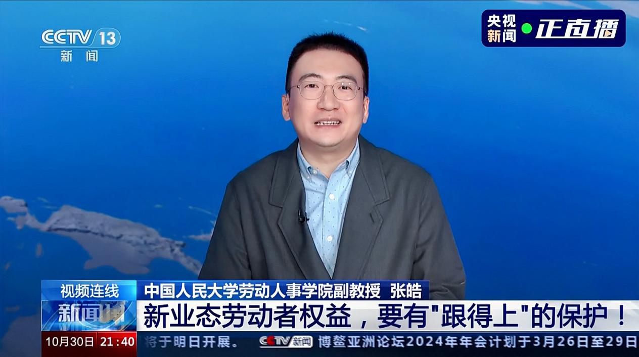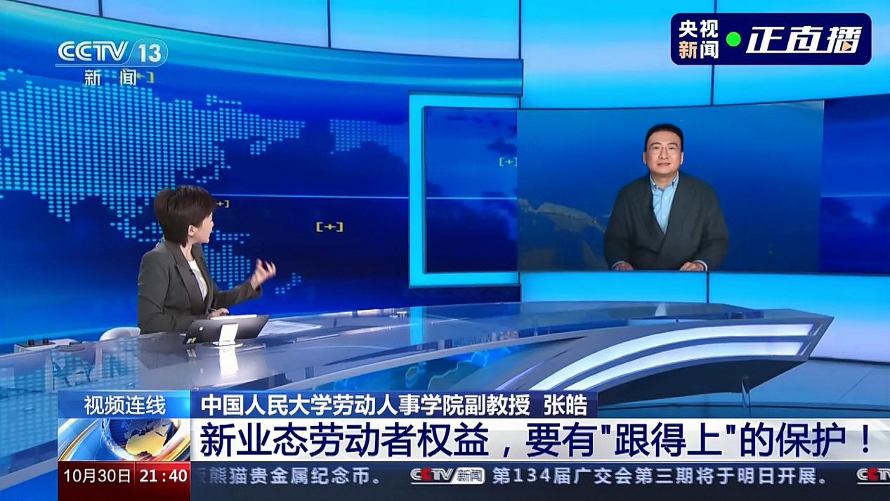 2023年10月30日晚21:30,应中央电视台《新闻1+1》节目邀请,硬硬av 劳动关系系主任张皓副教授就新就业形态劳动者权益保障问题接受了主持人柴璐的直播专访。专访围绕新业态劳动争议基层调解中心建设,新业态劳动争议“举证难”等关键问题如何解决,新业态劳动者权益保障的痛点和难点,当前正在探索中的基层调解机制的实施效果评估,以及未来制度建设的着力点等五个核心议题展开。