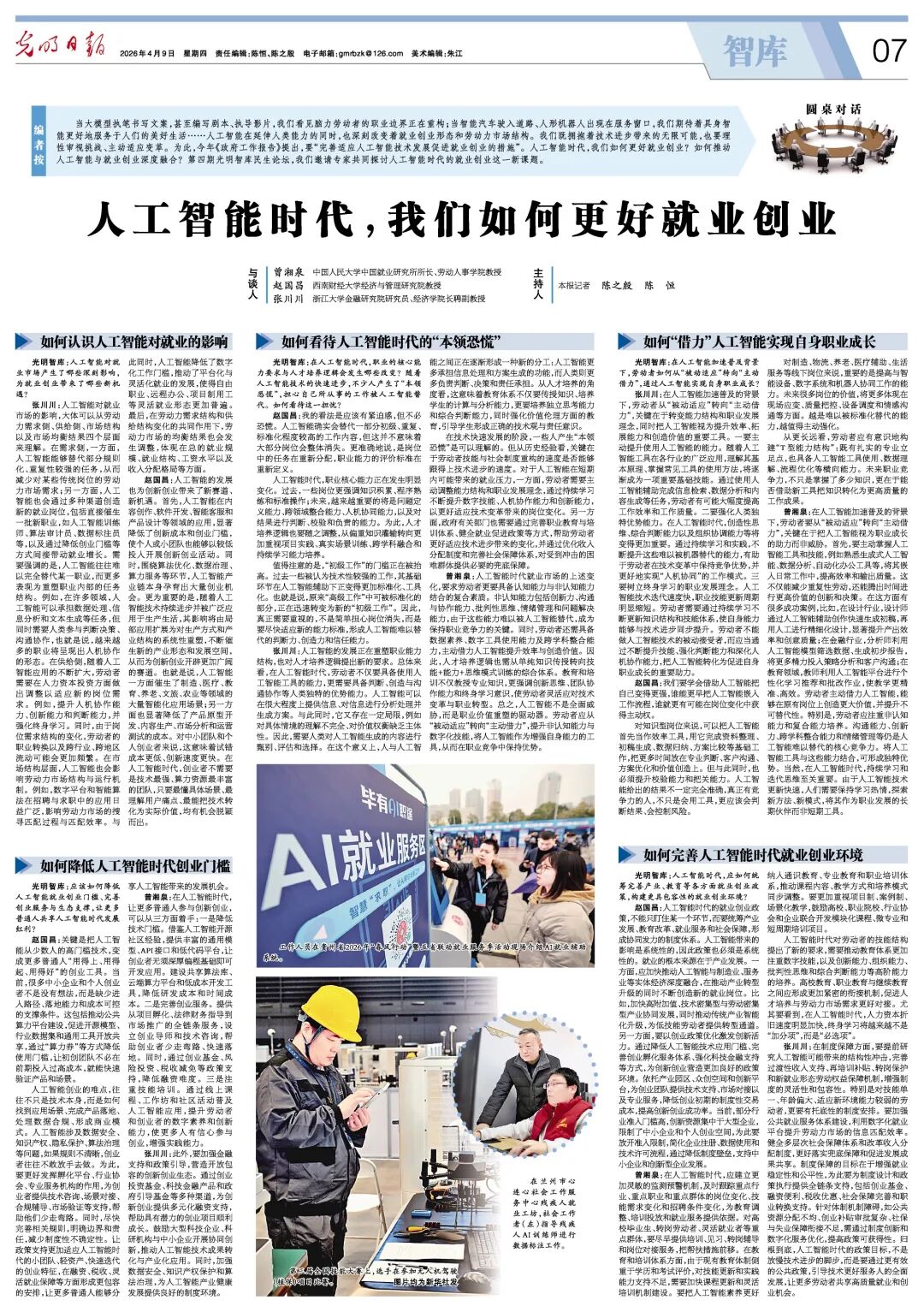 曾湘泉教授受邀出席第四期光明智库民生论坛,围绕 “人工智能时代,我们如何更好就业创业” 主题参与讨论,相关内容被《光明日报》报道,现将全文转载如下: