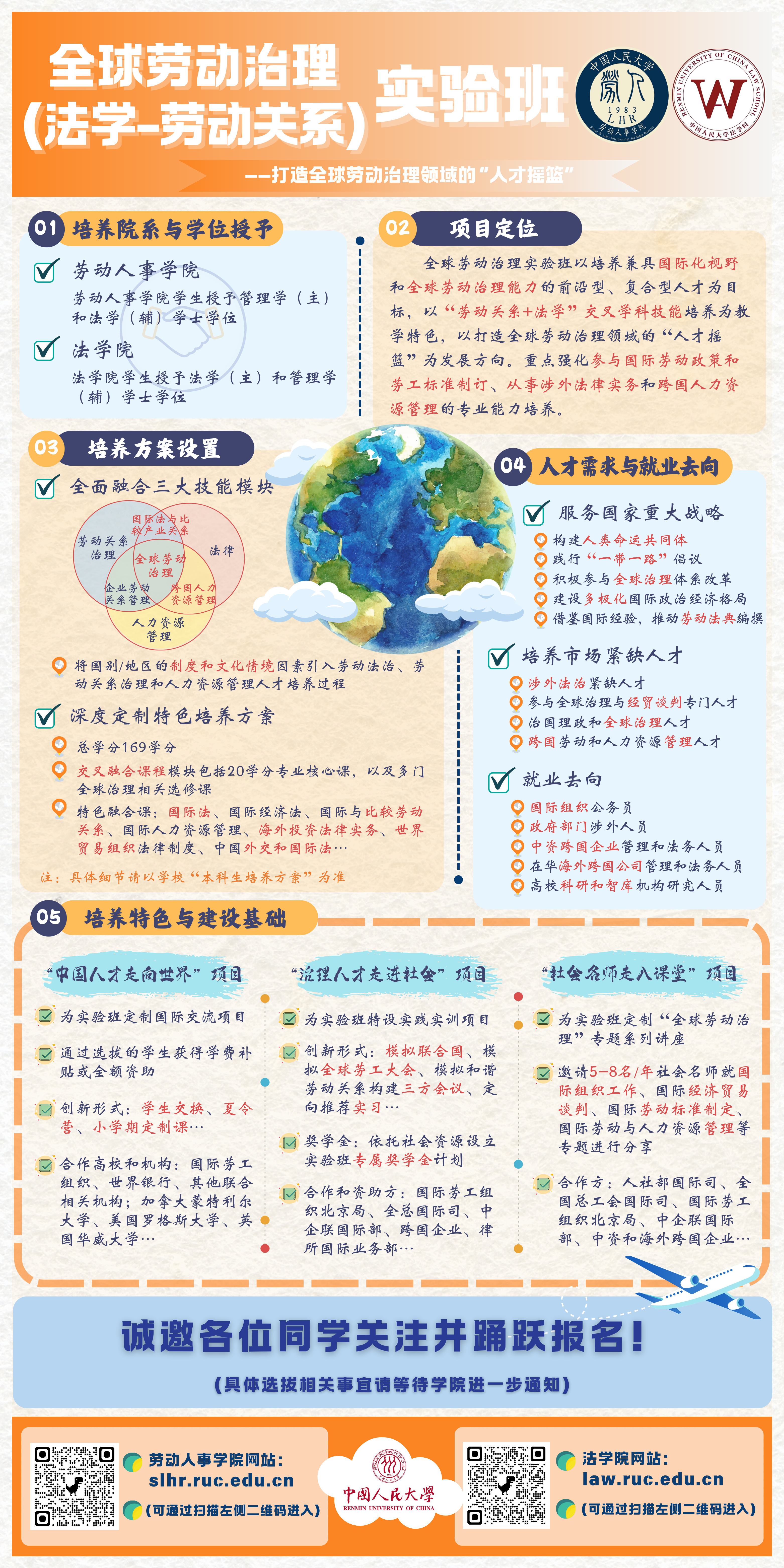 全球劳动治理实验班由硬硬av 和法学院合办,依托国家级一流本科专业“劳动关系”和“法学”建设,项目于2023年7月经评议获批启动,2023-2024学年秋季学期即将开展首批学生选拔培养工作。