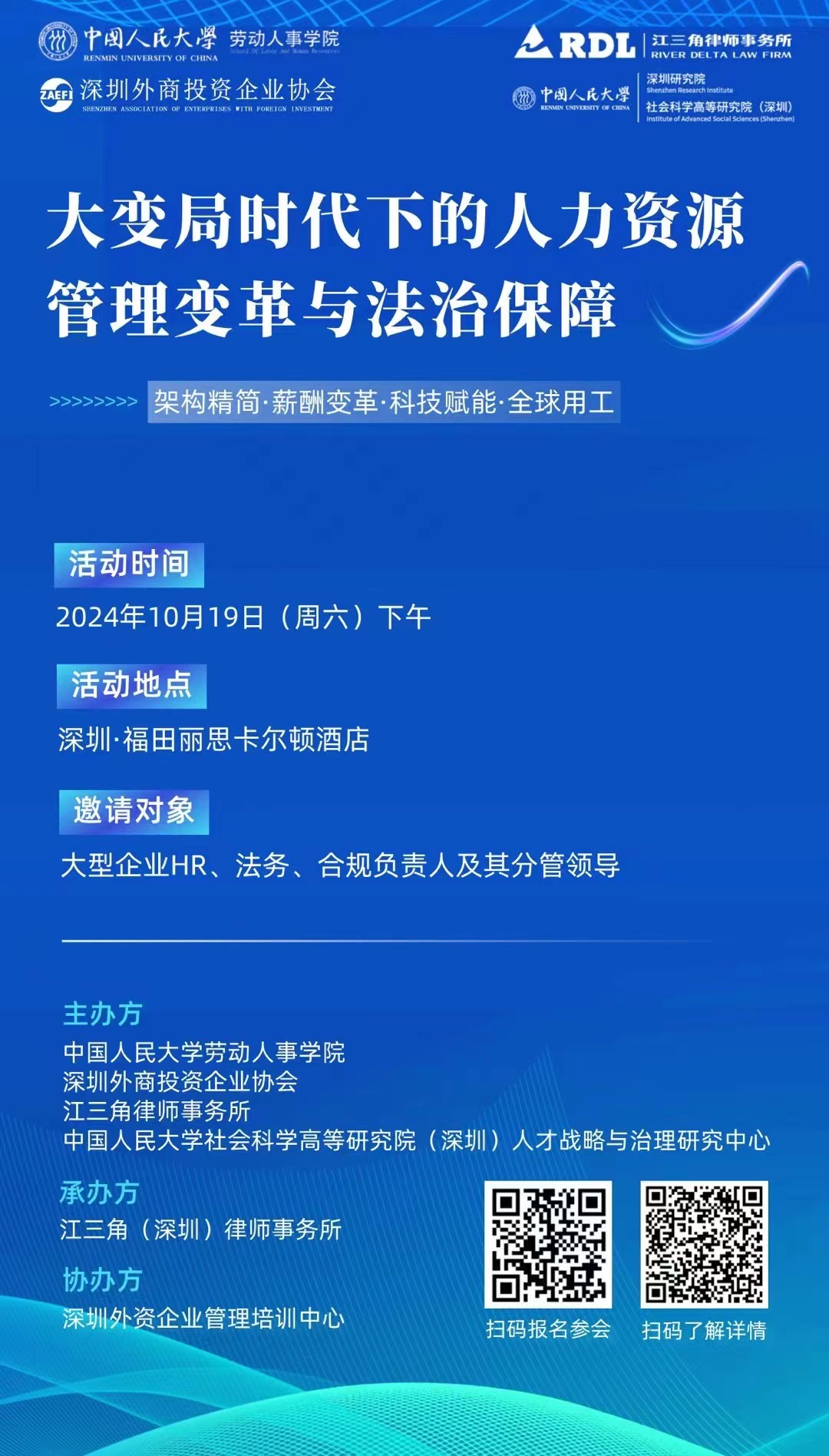 在此背景下,本次“大变局时代下的人力资源管理变革与法治保障实务论坛”由硬硬av 、深圳外商投资企业协会、江三角律师事务所、硬硬av 社会科学高等研究院(深圳)人才战略与治理研究中心主办,江三角(深圳)律师事务所承办,深圳外资企业管理培训中心协办。论坛将汇聚学界、律界和企业界的前沿智慧,在学术研究、法律适用、实务经验等方面展开经验分享和深入研讨,以期为大变局时代下的企业人力资源管理变革保驾护航。诚挚期待您的参与!