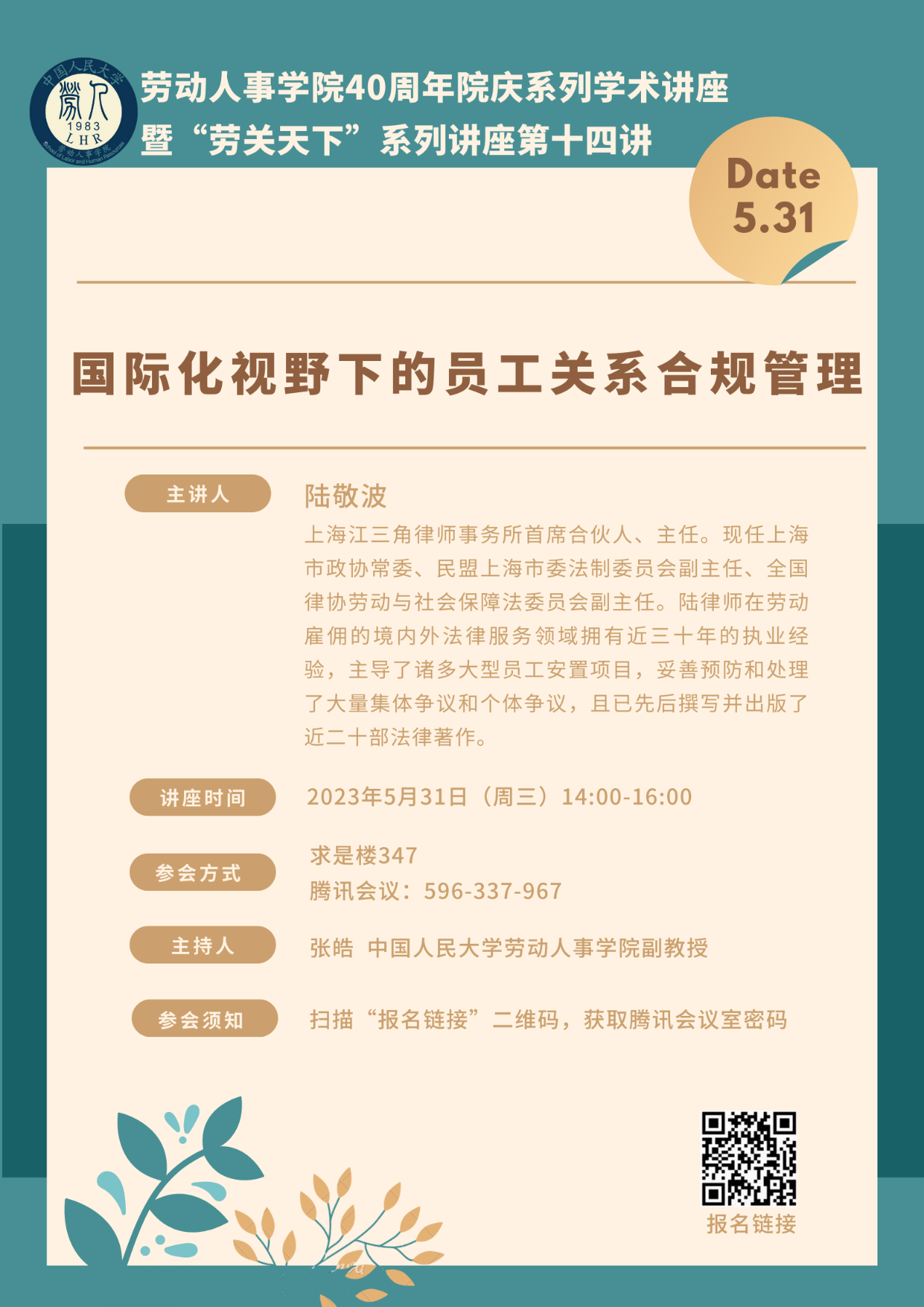 摘要:高质量对外开放作为我国的基本国策,是推动我国高质量发展的重要内容,也是全球化与逆全球化冲击下的必然选择。随着中国企业“走出去”的步伐加快,出海企业以及外派员工和属地化员工的数量不断增加,使得各企业对于国际劳动法的刚性需求激增,而现实情况则显示出域外与国际劳动法研究与专业服务供给不足的问题。讲座将秉持国际化视野,从“总览:入乡随俗”“分述:全链合规”两个方面深入探讨员工关系合规管理的总体框架及其具体细节,助力企业建立健全全球用工合规管理体系,加强员工关系合规管理的流程化,赋能中资集团型企业业务及职能团队面对不同国家与不同法律体系下的快速合规应对能力与风险防范能力,以保障员工利益,提高企业竞争力,以及更好地实现我国高水平对外开放目标。