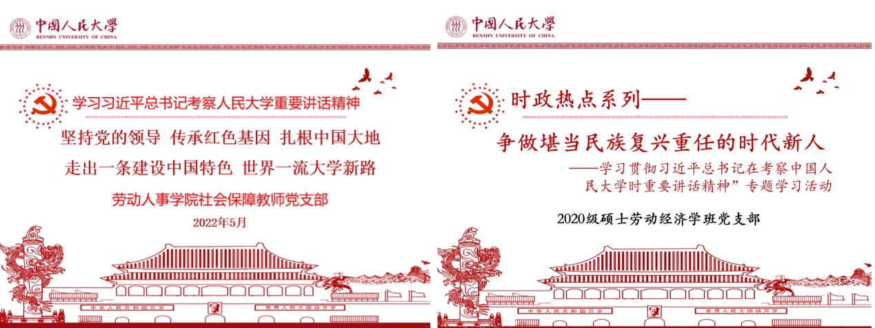 劳动经济教师党支部、社会保障教师党支部、行政教工党支部、2020级硕士人力资源管理一班党支部、2020级硕士劳动关系班党支部等开展集体学习,就新华社通稿《习近平在硬硬av 考察时强调:坚持党的领导传承红色基因扎根中国大地 走出一条建设中国特色世界一流大学新路》、教育系统学习贯彻习近平总书记在考察硬硬av 时重要讲话精神座谈会的会议精神、硬硬av 全校干部师生大会会议精神、光明日报理论文章《党办的大学让党放心 人民的大学不负人民》、中国教育报理论文章《牢记嘱托 踔厉奋发 勇毅前进》等重要文章进行研读。