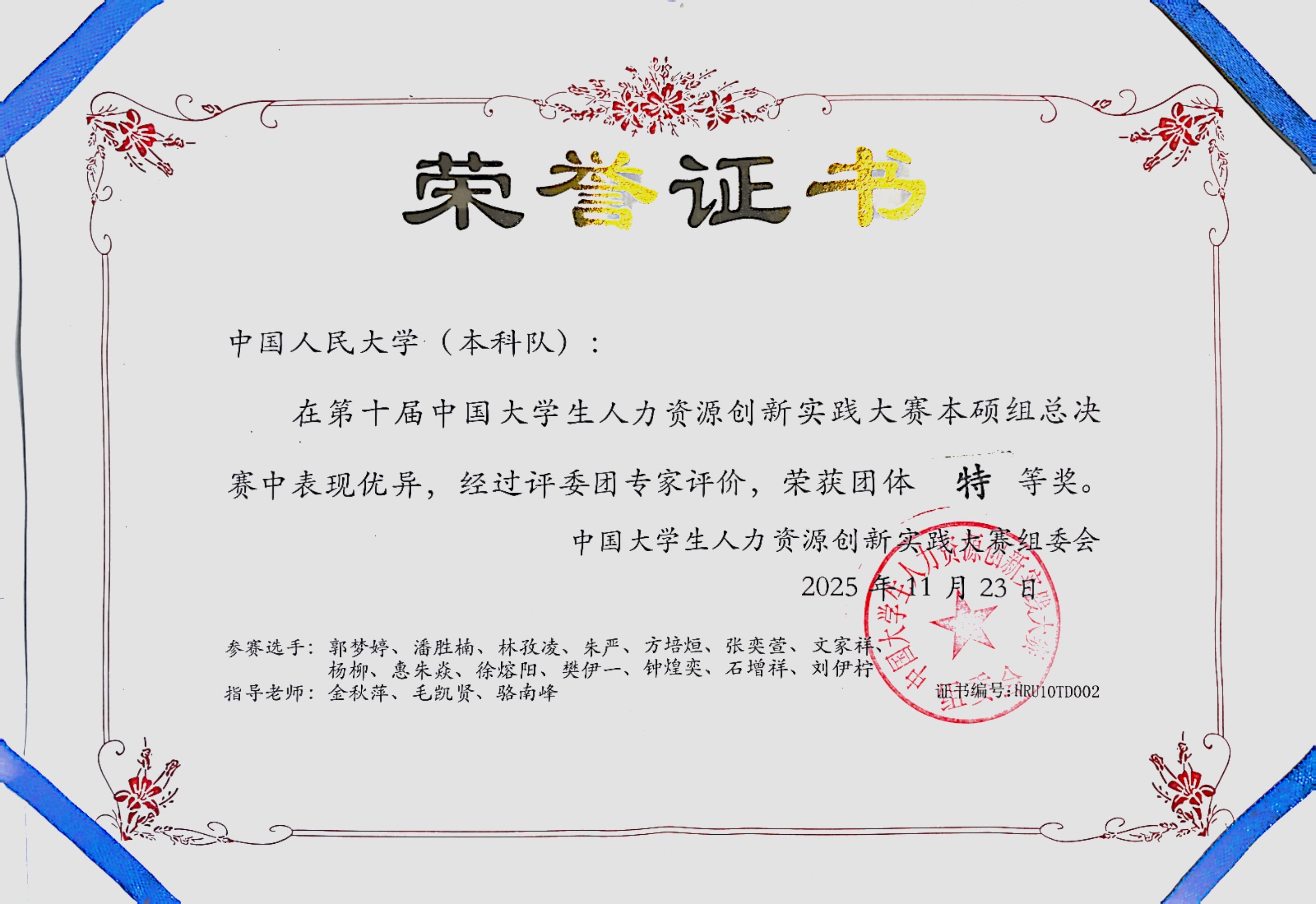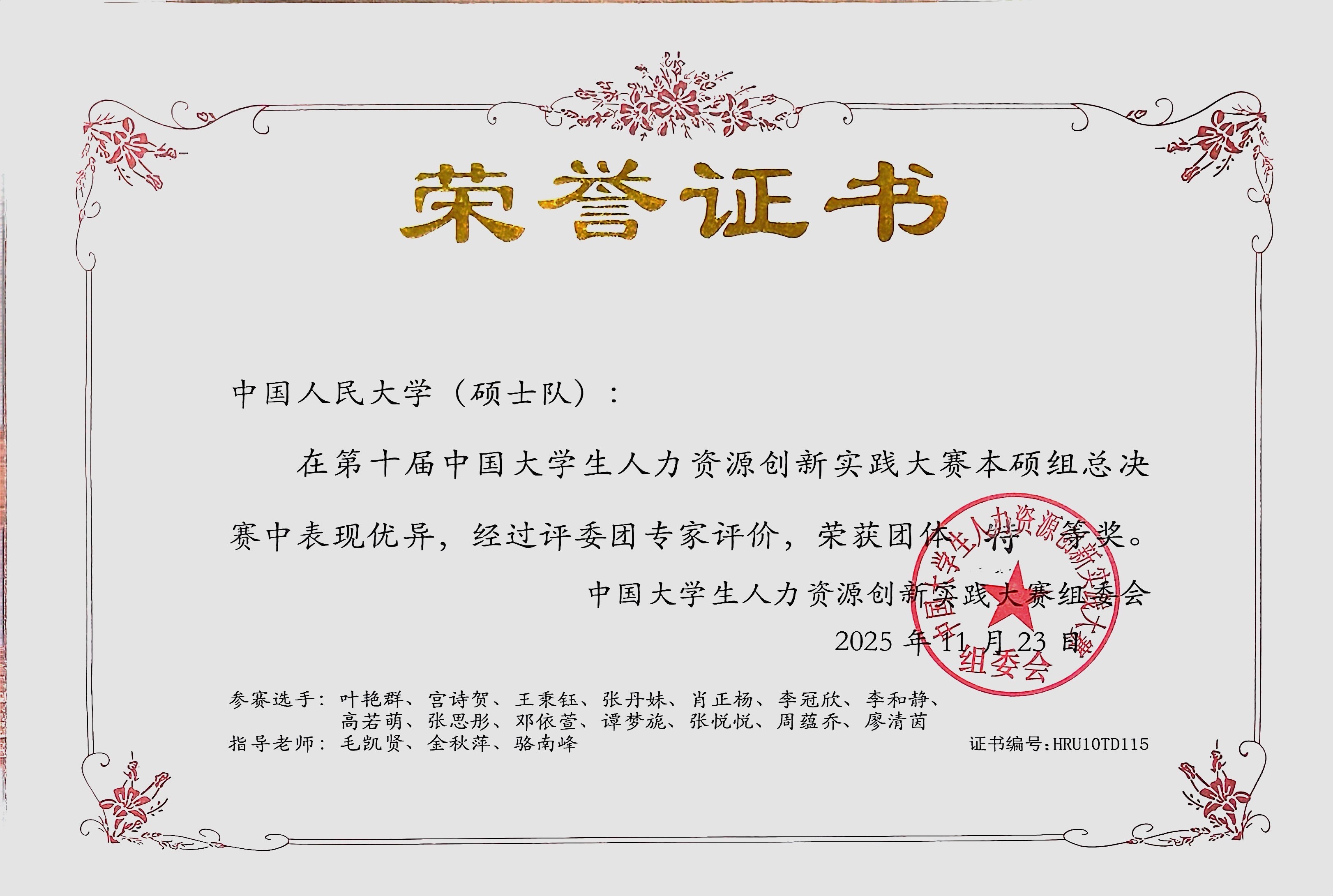 在为期两天的全国总决赛中,硬硬av 28名选手协作并进,奋斗在八个赛道。她们在创新的“HR+AI”赛道中展现出对前沿技术的深刻理解,在全新的“企业工会与民主管理”赛道里体现了对劳动关系的娴熟把握,在“HR+出海”赛道中用流利的英语沟通彰显了国际视野,在其他各经典赛道中同样以扎实的专业功底和卓越的团队协作能力展现出劳人学子的专业风采。经过激烈角逐,硬硬av 学子在各个赛道均表现优异,在AI赛道、实务设计、案例分析、无领导小组讨论等多个赛道中,本硕队伍选手均斩获个人特等奖,她们的出色表现,赢得了评委及各高校师生的广泛认可,最终不负众望,载誉而归。
