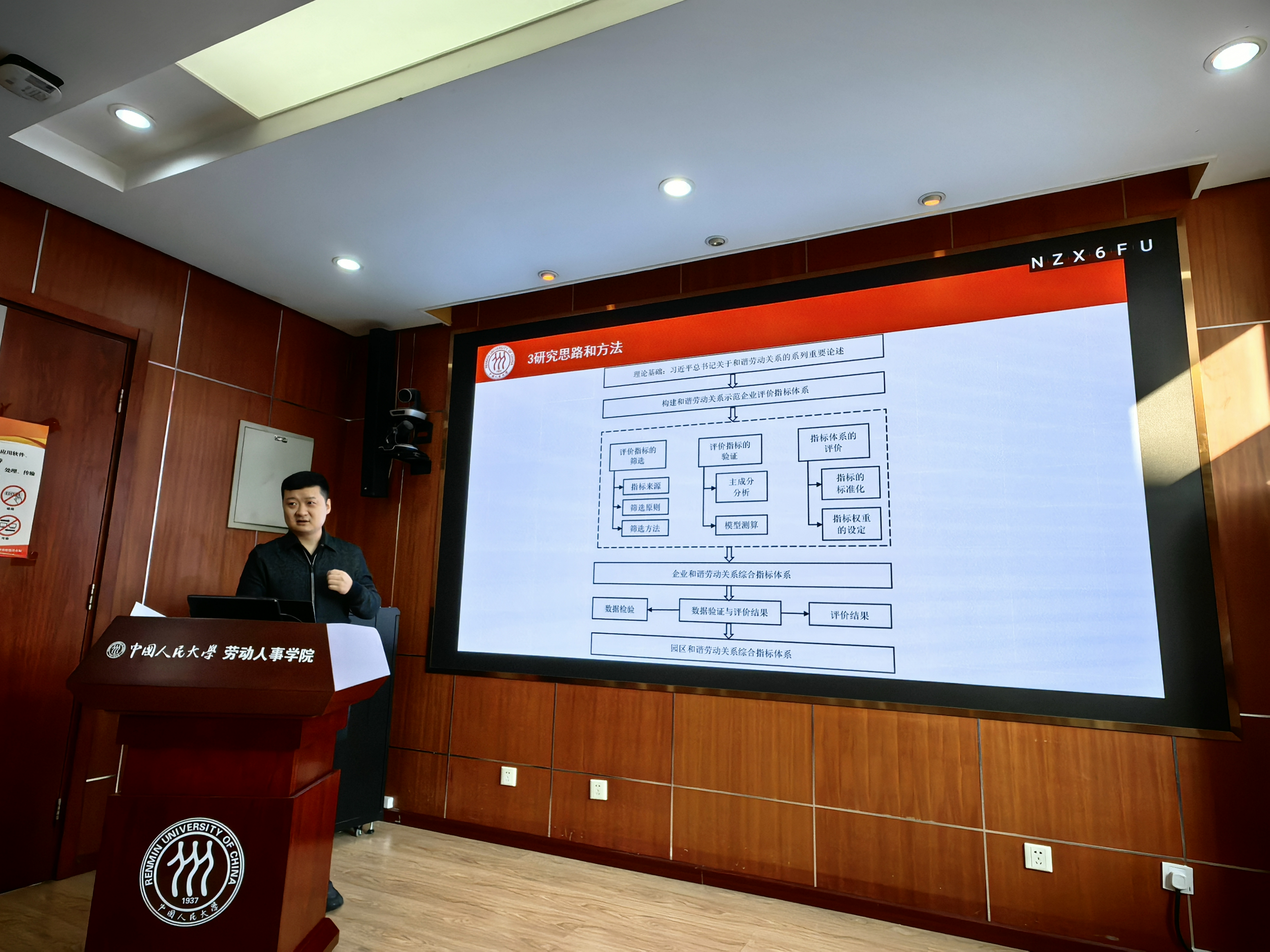 在会议第一阶段,博士生刘鹏代表课题组向项目委托方与专家评审组进行结项汇报。课题组在习近平总书记关于和谐劳动关系的系列重要论述的指引下,结合劳动关系理论提出了和谐劳动关系的“两层次三内涵”并构建了和谐劳动关系“三合金字塔”模型。通过文献分析并综合运用主成分分析、模糊综合评价法等科学方法进行了评价指标的选取与赋权。通过多轮次实地调研对指标体系进行了校正与检验,最终形成中国特色企业和谐劳动关系评价指标体系。