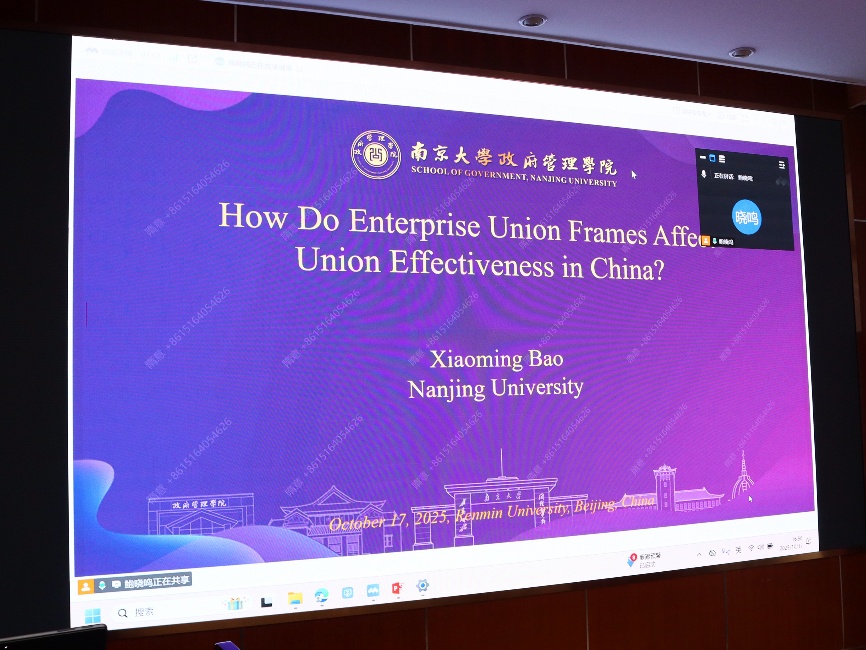 南京大学政府管理学院鲍晓鸣研究员线上参会,他聚焦工会话语框架及其对集体协商效果的影响,揭示了企业工会的话语能力对工会效能的重要影响。