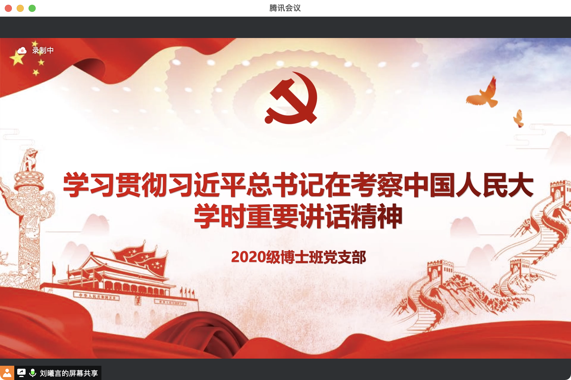首先,2020级博士班党支部书记刘曦言同志带大家系统回顾了习近平总书记在考察硬硬av 时重要讲话精神。学习围绕四个主题展开,依次为“思政课的本质是讲道理”、“继承优良传统,赓续红色血脉”、“必须有世界一流的大师”、“打造中国特色、世界一流的学术资源信息平台”。最后,她带领支部成员重温了总书记对人大学子的殷切期望:希望全国广大青年牢记党的教诲,立志民族复兴,不负韶华,不负时代,不负人民,在青春的赛道上奋力奔跑,争取跑出当代青年的最好成绩!