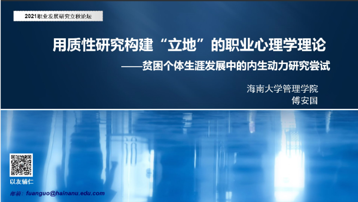 傅安国副教授的报告主题为“用质性研究构建“立地”的职业心理学理论——贫困个体生涯发展中的内生动力研究尝试”。报告首先从西方社会科学及心理学的背景谈起,指出研究好中国问题应该采用多元的研究范式。其后,傅老师以脱贫内生动力研究为例,用扎根理论讲述了一个典型的中国故事。最后,傅老师强调了研究应有回应社会现实的责任,并给出具体思路。于坤老师就研究中理论与实践的匹配性、质性与量化方法的结合、中国概念的国际化等问题与傅安国老师进行了探讨。