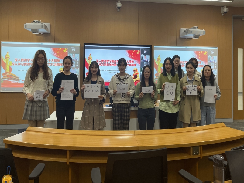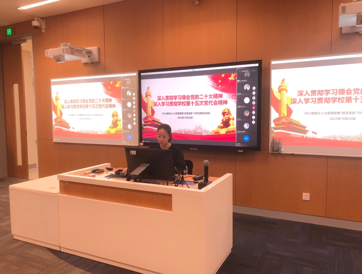 10月20日晚,2022级硕士人力资源管理1班党支部于立德楼0802开展“深入学习领会党的二十大精神和学校第十五次党代会精神”主题党日活动,主要环节包括集中学习、书法学习和心得交流。支部副书记杨欣悦主持本次活动,支部全体党员和部分积极分子通过线上线下相结合的方式参与本次学习。