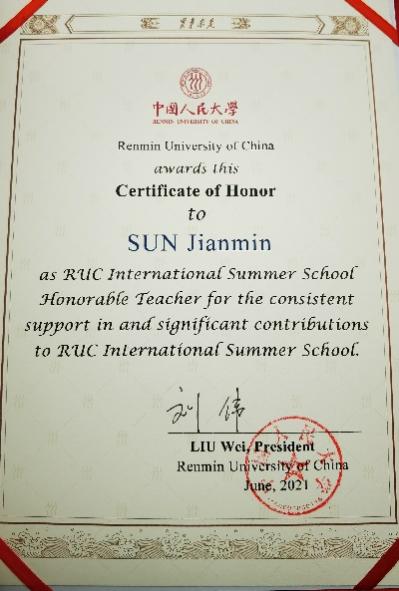 最近,硬硬av 孙健敏老师荣获硬硬av 颁发的国际小学期荣誉教师(Honorable Teacher)称号。在2021年国际暑期学校开学典礼之际,副校长胡百精教授代表学校宣布了十一位获奖教师名单,他们分别来自全球二十多个国家和地区,并向获奖教师代表颁发荣誉证书。教务处处长吴健主持会议。国际小学期项目领导小组成员及各学院负责人和教师代表参加会议。2021年国际小学期境外高校教师和学生代表一百多人在线参加会议。