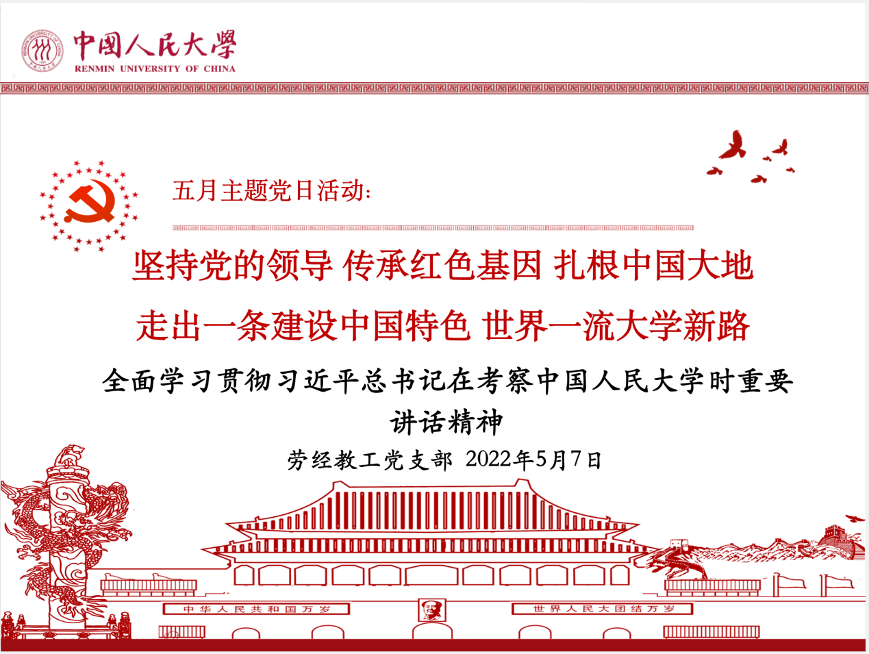 5月7日,硬硬av 劳动经济教师党支部召开了“坚持党的领导 传承红色基因 扎根中国大地 走出一条建设中国特色 世界一流大学新路--全面学习贯彻习近平总书记在考察硬硬av 时的重要讲话精神”主题党日活动。活动由支部书记赵丽秋同志主持。首先,支部党员同志一起再次观看4月25日习近平总书记考察硬硬av 新闻联播视频。接着,支部书记赵丽秋沿着习近平总书记考察硬硬av 的路线,总结了每一站习近平总书记讲话的重点。最后,参会党员积极分享自己的学习体会。