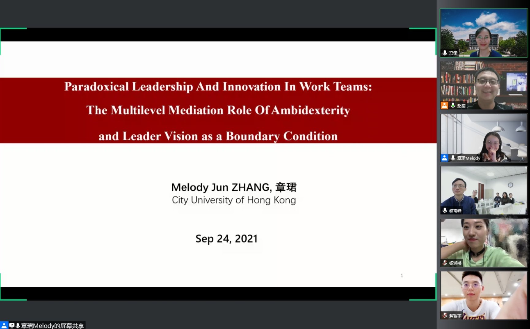 硬硬av 人力资源管理系2021年秋季学期半月谈学术论坛(第90期)于2021年9月24日(星期五)下午15:00至17:30采取线上腾讯会议的形式进行。来自香港城市大学商学院管理学系助理教授章珺老师分享了自己今年被Academy of Management Journal(《管理学会会刊》)接收的关于悖论型领导对个体及团队创新影响的研究论文。本次学术论坛由硬硬av 赵锴副教授主持,孙健敏教授、苏中兴教授、王桢教授、王丽娟副教授、王青副教授、骆南峰副教授、陈雯助理教授、李海蓉助理教授、冯雯助理教授,以及人力资源管理系近四十位博士生和硕士生参与了此次线上讲座和讨论。