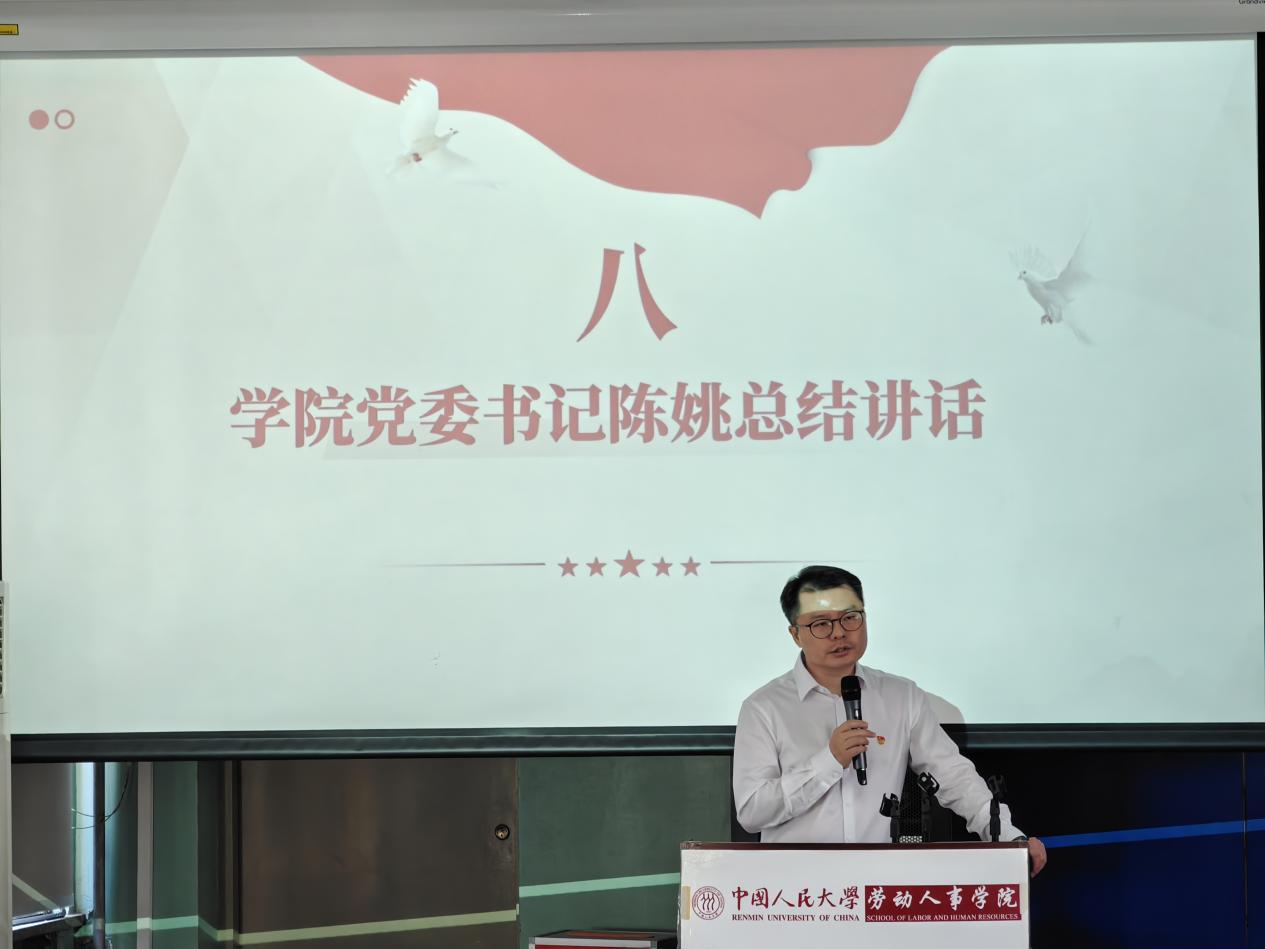 最后,学院党委书记陈姚总结讲话,以作风建设开篇立题。他指出,纠治“四风”更要树立“劳人新风”,党内表彰是弘扬正气,加强党组织和党员队伍建设的有效手段,既要追源“大先生”,也要看到身边模范。他强调,希望获奖同志及支部继续努力,将个人优秀辐射集体,将优秀集体再度凝练升华,以高层次样板支部为目标争先创优。要深入探讨新时代劳人新风内涵,自上而下汇集全院共识,全院党员一股劲,优良作风代代传。