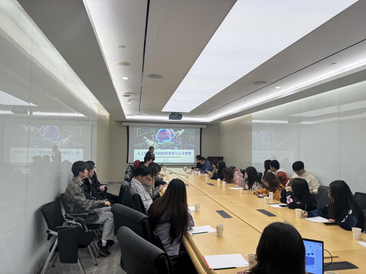 在数智企业体验馆中,师生共同观看了“企业数智化1-2-3”主题展示大屏,直观了解了企业数智化进阶模型。讲解员围绕用友AI落地路径与软件产品矩阵展开系统介绍,从数智化底座平台,到人力、财务、营销等细分业务展厅,逐步呈现了研发投入对企业发展的支撑作用,以及AI技术在促进业务协同、提升运营效率方面的实际价值。随后,MHR专硕项目校外实践导师、用友副总裁张月强为同学们带来题为《人工智能时代的组织变革与人才管理:AI智能体在推动组织创新中的应用实践》的专题讲座。他提出“AI优先思维”,并从业务流程重构、行业应用拓展、组织协作演变三个维度,深入剖析了AI对企业管理的深远影响,强调人力资源管理者应主动推进能力升级,以更好地应对智能时代的挑战。在互动环节,同学们围绕“AI员工替代”“人工智能幻觉”等热点议题踊跃提问,张月强老师结合企业实践案例一一予以回应,现场气氛热烈。活动最后,赵锴老师作总结发言。他感谢用友公司及张月强老师对本次实践教学环节的大力支持,表示此次活动为同学们拓宽了视野、提供了宝贵的实践思路,并期待未来在校企合作方面开展更深入的交流与共建。