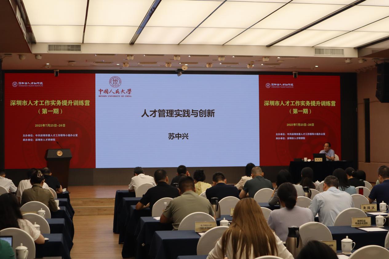 2025年7月25日,由深圳市委组织部、市人才工作局主办的深圳市人才工作实务提升训练营(第一期)开班。深圳市人才工作局局长罗冰作开班动员讲话,硬硬av 苏中兴教授应邀作开班第一讲,就人才管理实践与创新进行了全面讲解,市委人才工作领导小组成员单位40余家有关处室处长、副处长,各区组织部门分管副部长、人才局局长、人才科室负责人,深圳各高校、科研院所等人事部门有关负责同志,各区重点产业园区人才专员等150余人参加了此次培训。