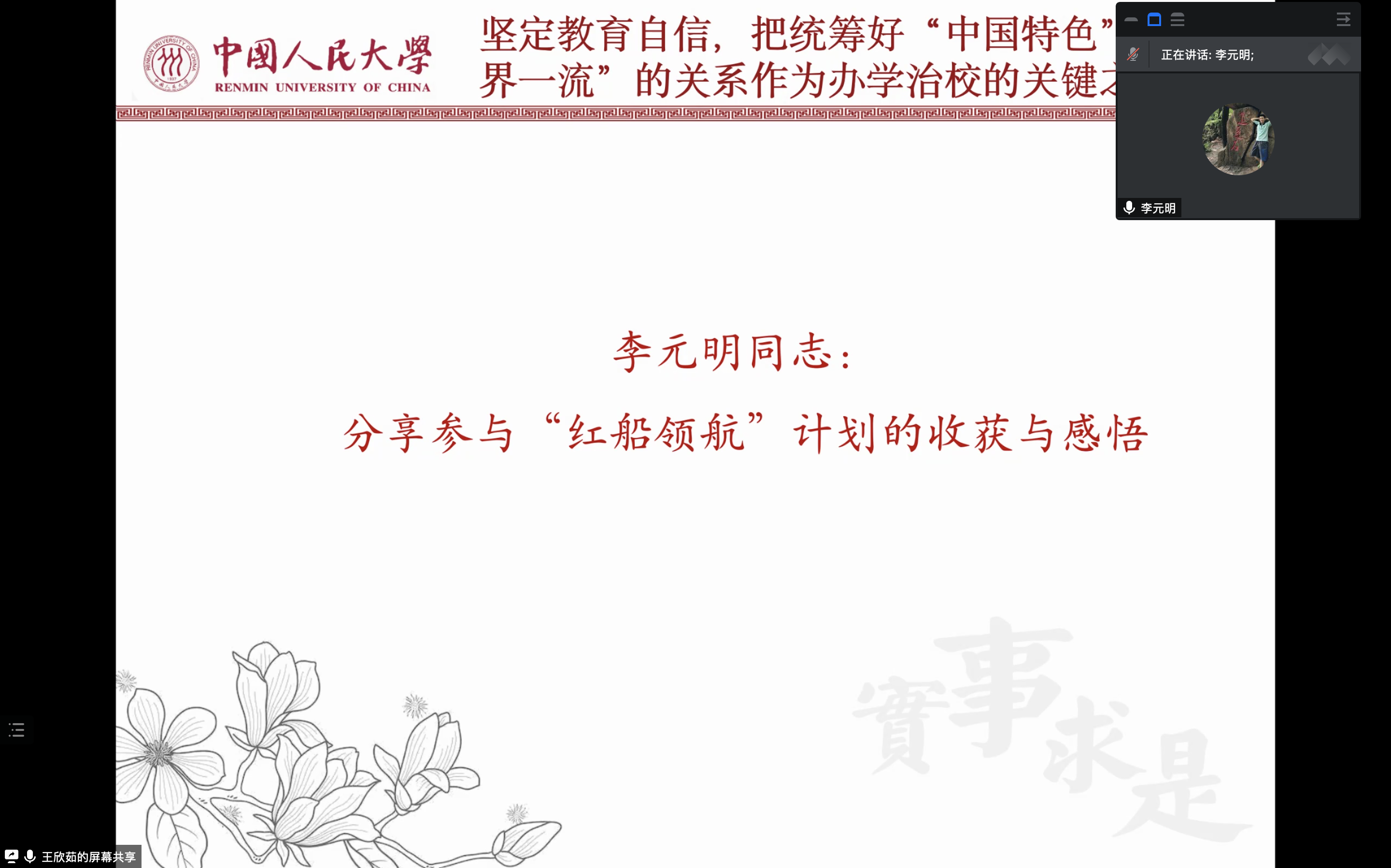 在坚定教育自信部分,王欣茹带领与会同志学习原文,生动讲解了“中国特色”与“世界一流”的关系,鼓励大家自觉坚定中国特色高等教育的道路自信、理论自信、制度自信、文化自信。作为硬硬av 学生党员教育品牌项目,“红船领航”新生党员先进性熔铸计划是学校培养环节中的特色之举,支部党员李元明分享了自身参与“红船领航”计划的收获与感悟。