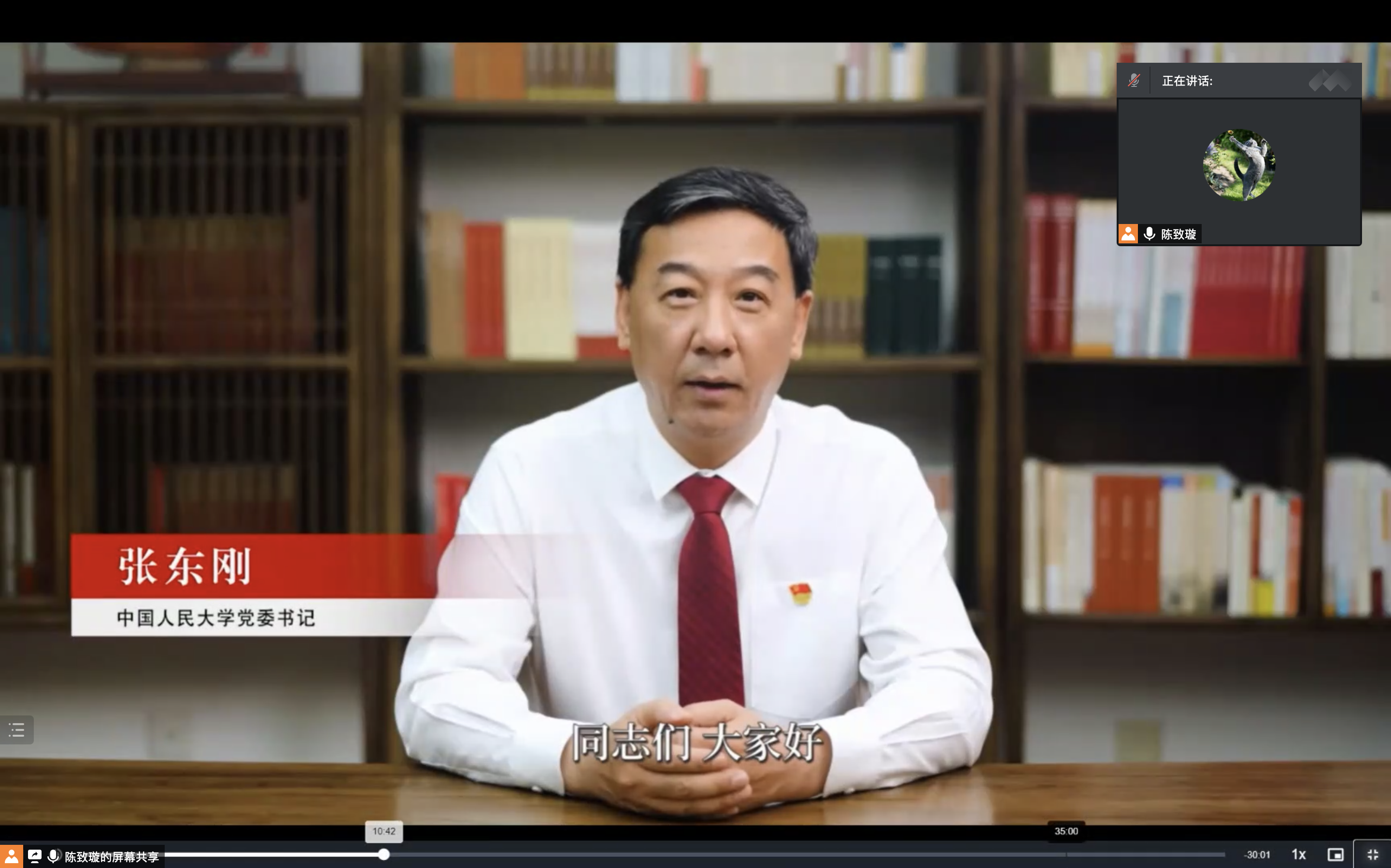 在传承红色基因部分,陈致璇带领与会同志云游校史展,以线上形式参观学校博物馆。老照片和旧物件承载了校史中的红色根脉,生动呈现了硬硬av 光荣的革命传统和鲜明的红色基因。参观结束后,大家集体收看了张东刚书记主讲的示范微党课,对硬硬av “为党育人为国育才”的初心和使命有了更深刻的理解。陈致璇鼓励大家在继承革命传统、赓续红色血脉、擦亮精神底色上要态度鲜明、行动坚决,自觉深入学习党史、新中国史、改革开放史、社会主义发展史和校史,在传承红色基因中激发使命担当,勇做“复兴栋梁、强国先锋”。