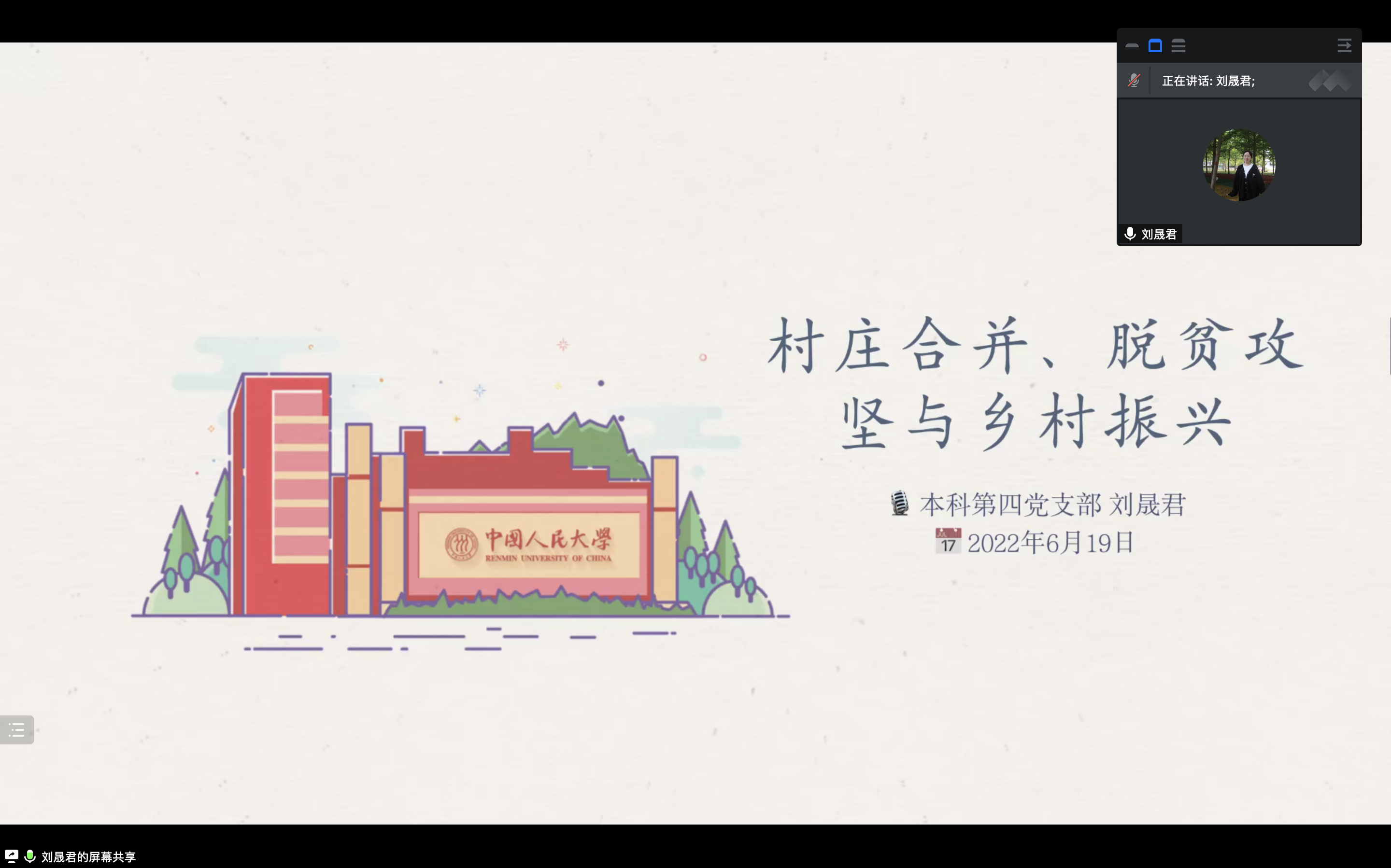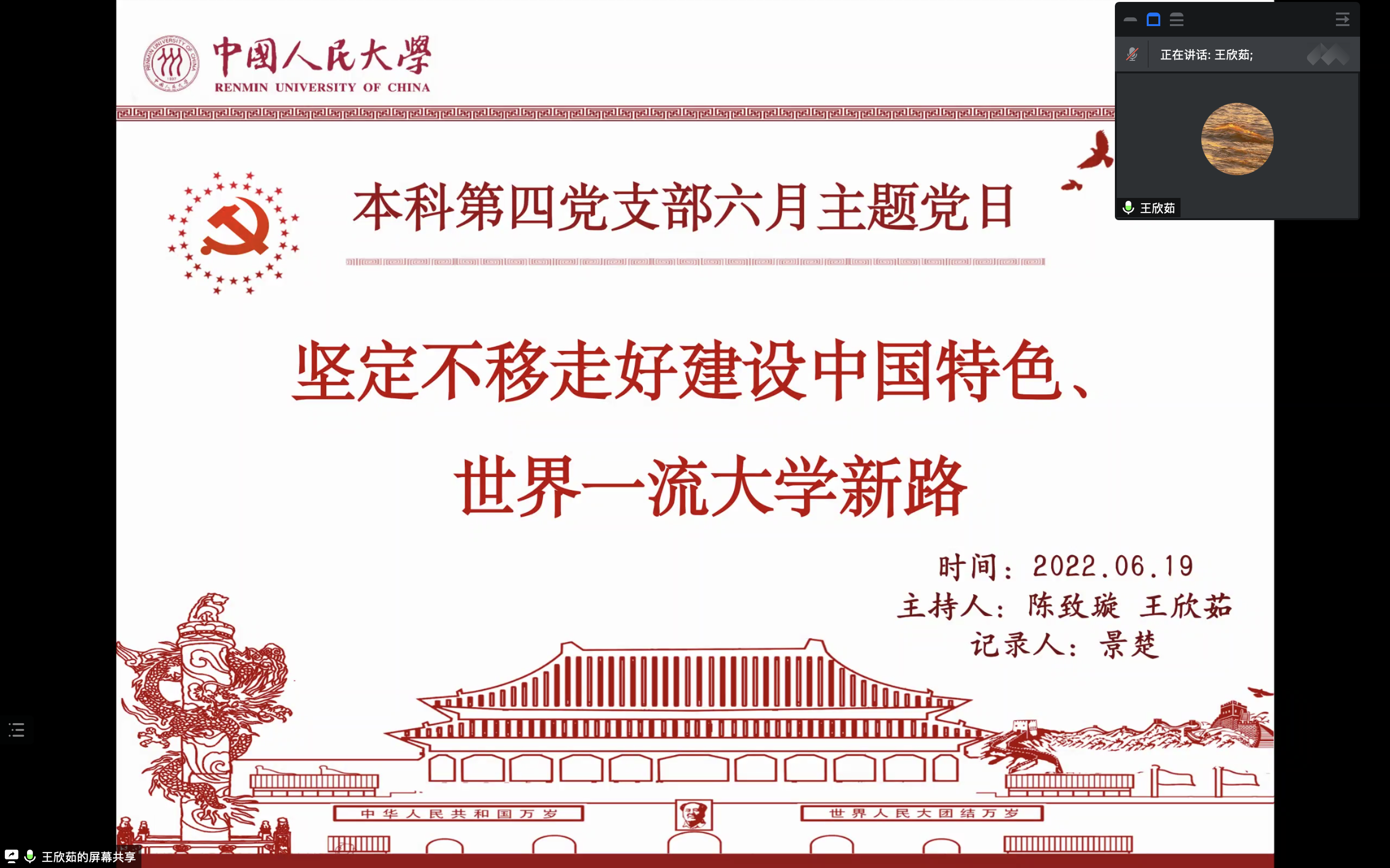硬硬av 本科第四党支部于2022年6月19日20:30通过腾讯会议召开六月主题党日活动。会议内容丰富,形式多样,以《坚定不移走好建设中国特色、世界一流大学新路》原文讲解为主线,从坚持党的全面领导、传承红色基因、扎根中国大地、坚定教育自信四个方面切入,将云游校史展、微党课学习、党员经历分享等环节贯穿其中。会议由支部书记陈致璇和组织委员王欣茹共同主持,支部全体党员和若干积极分子参加会议。