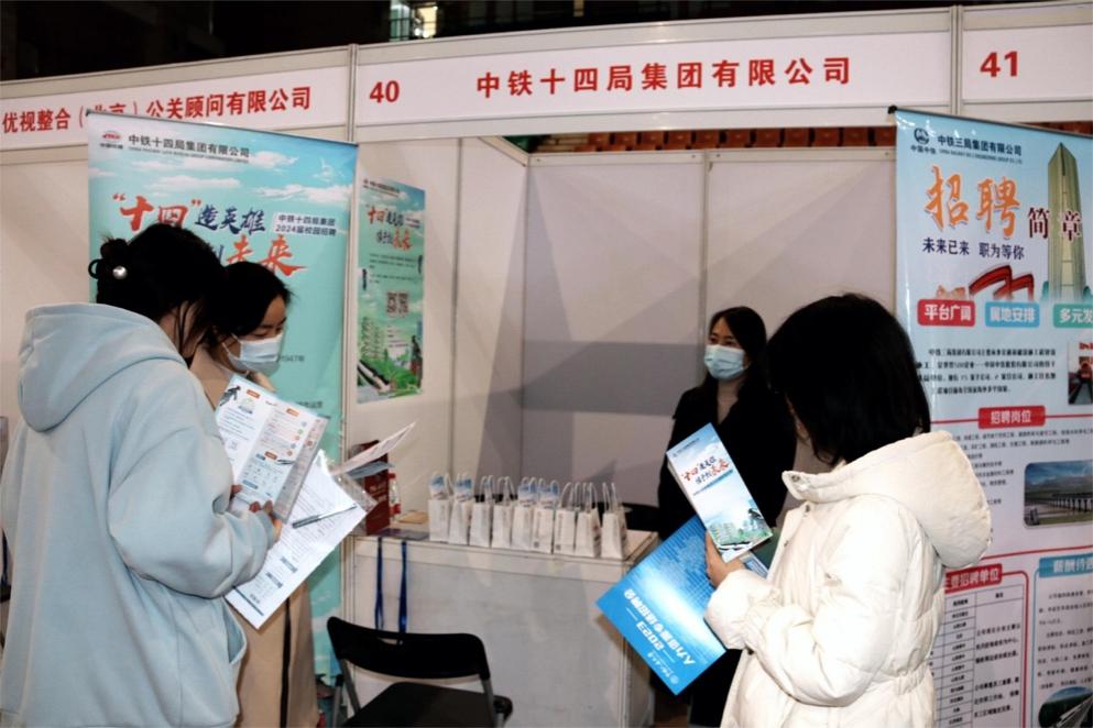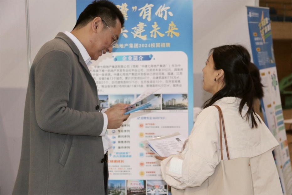 招聘会现场,来自中建六局华东建设、中建七局地产集团、中建八局浙江建设、中建城市建设发展、中铁三局集团、中铁十四局集团、中国建筑第五工程局、中交一公局海外分公司、中交第二公路工程局、中国电子科技集团公司第五十四研究所、电力规划总院、北京市政工程设计研究总院、中国通号研究设计院、国投云南新能源、腾讯公司、普华永道、北京易光淘网络技术、泸州老窖、梅花生物科技、北京国科军友工程集团、北京华夏建龙矿业科技、锐捷网络股份、牧原食品股份、中国恩菲工程、北京睿正企业管理咨询、双胞胎(集团)、北京长城企业战略研究所、歌尔股份、杭州天扬机械、北京四方继保自动化、北京理想汽车等各行各业45家用人单位的招聘人员与我校人力资源管理相关专业学生开展了积极有效的交流沟通。