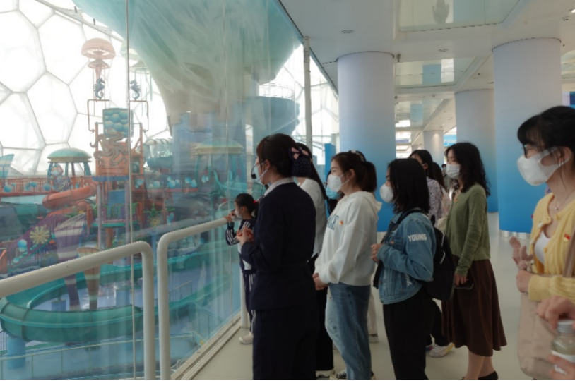 在大型嬉水乐园一旁,讲解人员为大家展示了乐园内丰富多彩的水上游乐项目。这些新奇有趣的文化创意,既实现了对水立方的继承与发展,又满足了人民群众日益增长的文化生活需要。