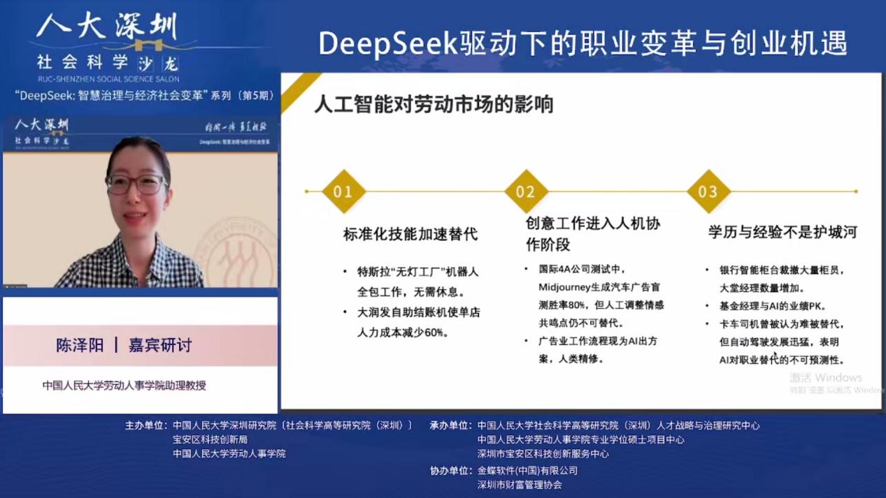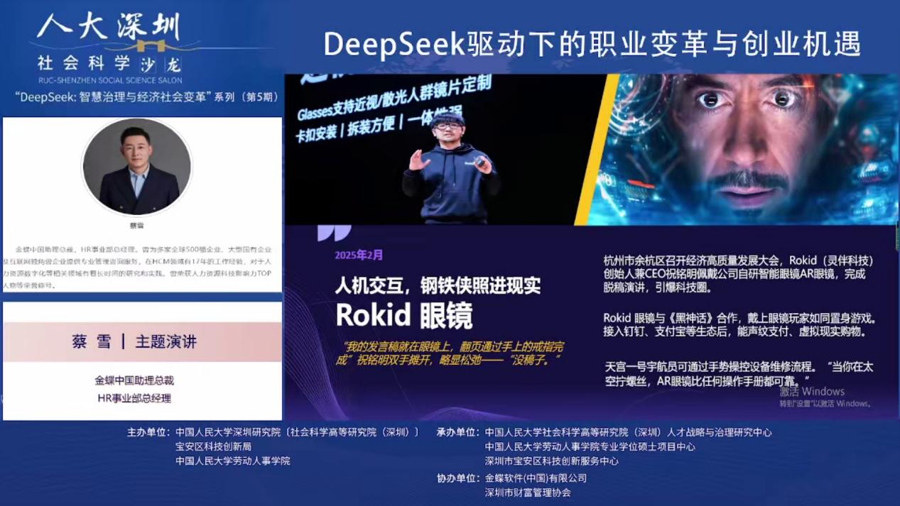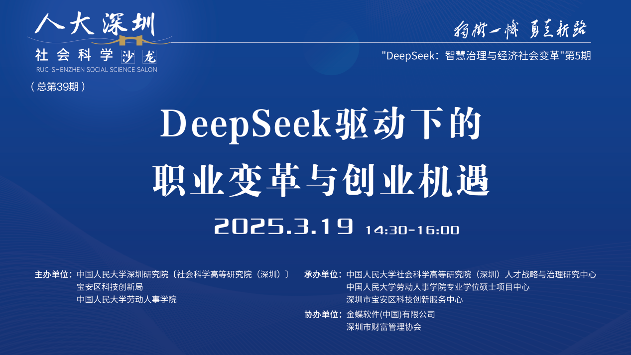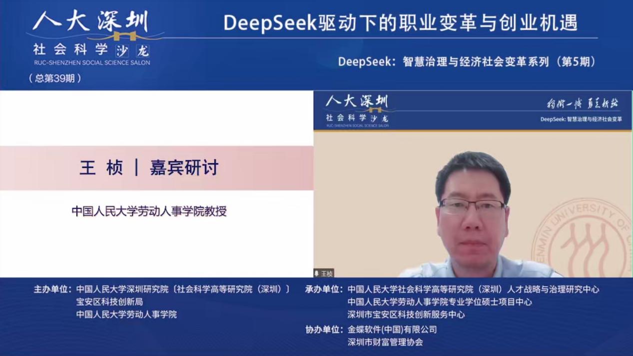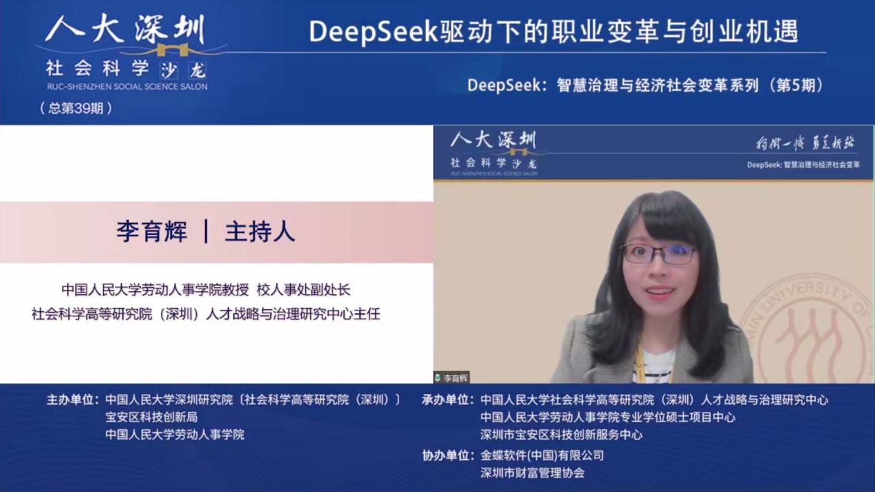 2025年3月19日下午,由硬硬av 深圳研究院〔社会科学高等研究院(深圳)〕、宝安区科技创新局和硬硬av 联合主办,硬硬av 深圳研究院〔社会科学高等研究院(深圳)〕人才战略和治理研究中心、深圳市宝安区科技创新服务中心、硬硬av 专业硕士项目中心联合承办,金蝶软件(中国)有限公司、深圳市财富管理协办人大深圳社科沙龙(总第39期)“DeepSeek:智慧治理与经济社会变革”第五期 “DeepSeek驱动下的职业变革与创业机遇”线上沙龙成功举办。金蝶中国助理总裁、HR事业部总经理蔡雪作主题演讲,硬硬av 党委书记陈姚,硬硬av 教授王桢,以及硬硬av 助理教授陈泽阳等多位在人力资源管理、数字化转型、职业发展领域具有深厚学术背景和实践经验的专家学者出席本次沙龙,共同探讨DeepSeek等人工智能技术对职业发展和创业创新带来的影响与机遇。本次沙龙由硬硬av 教授、校人事处副处长、社会科学高等研究院(深圳)人才战略和治理研究中心主任李育辉主持。