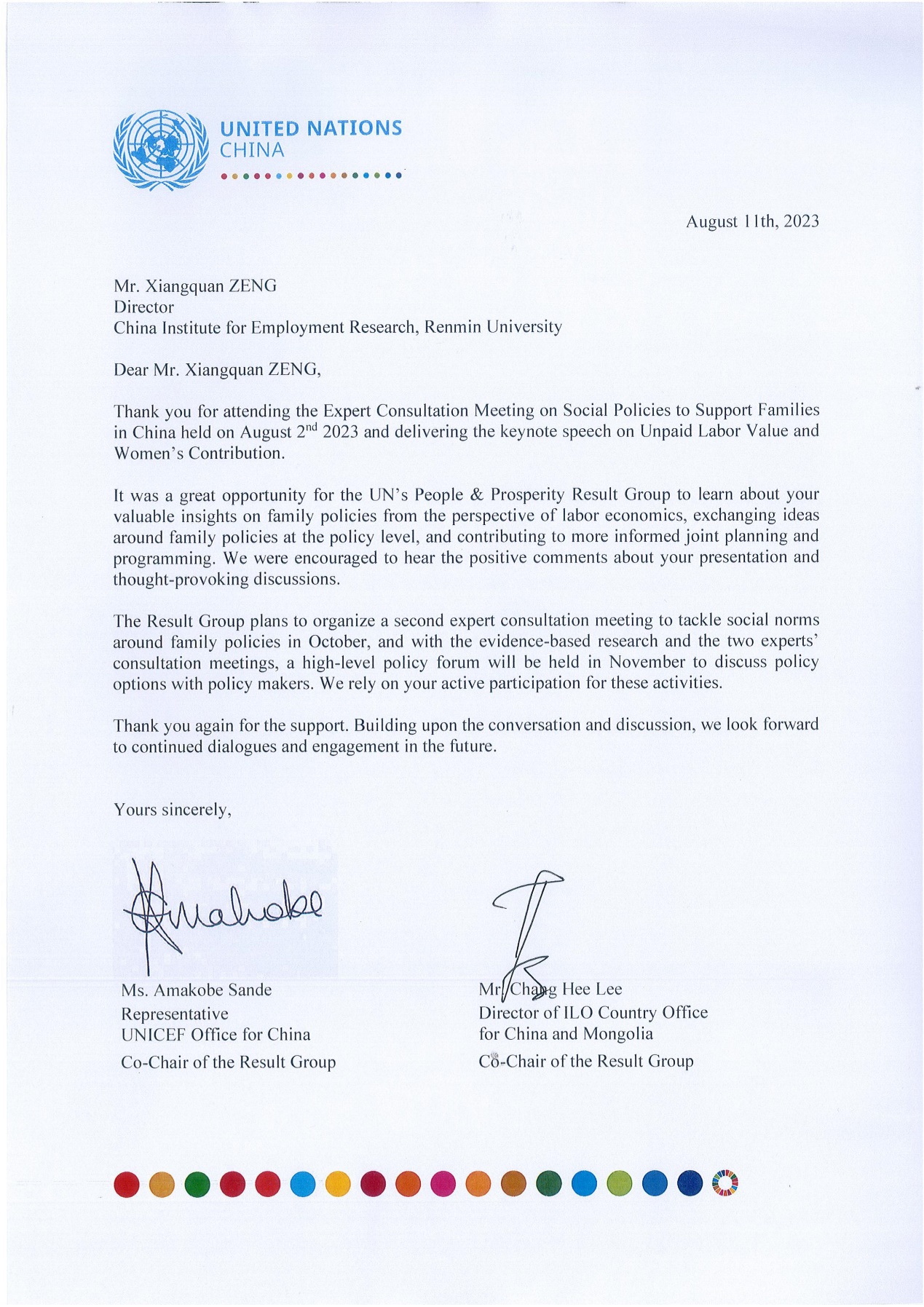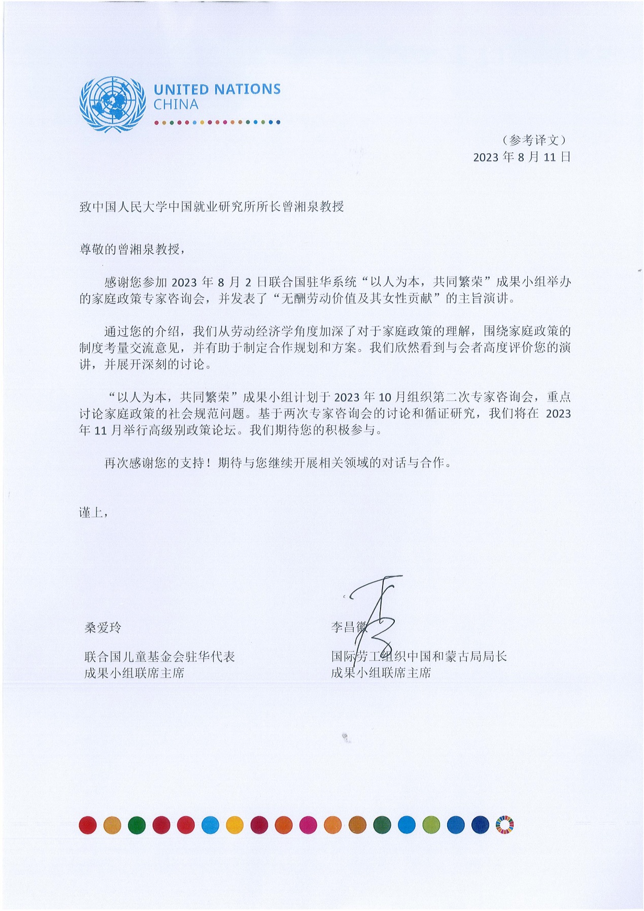 2023年8月11日,硬硬av 收到联合国驻华系统致曾湘泉教授的感谢信,对曾湘泉教授参与联合国驻华系统“以人为本共同繁荣成果工作组”举办的第一期中国家庭社会政策专家咨询会并发表主旨演讲表示感谢。