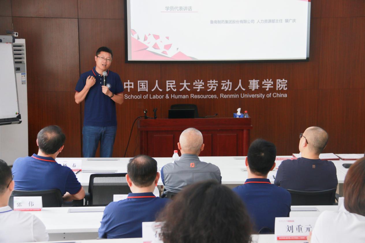鲁南制药集团股份有限公司人力资源部主任裴广庆,作为班级学员代表在发言中谈到,人大劳人院提供的一流师资、高水平的课程令班级学员受益匪浅,为研发技术人员出身的他从事人力资源管理工作,提供了科学的理论指导,给予了他从战略视角、心理学视角、财务视角等思维和认知方面的转变提升,学员们应当将理论知识学以致用、知行合一,将理论实践到各自的企业管理中,赋能所在的部门、组织及企业。