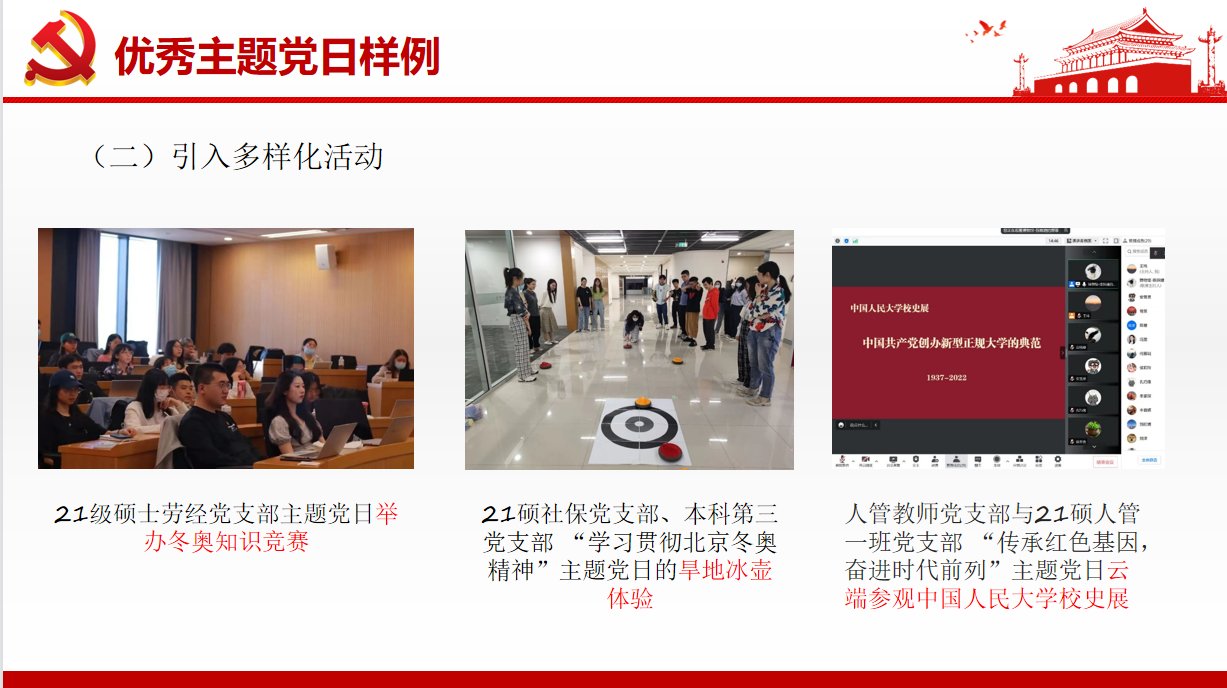 讲解完毕后,2021级硕士社会保障班党支部以“学习习近平总书记重要讲话精神,迎接党的二十大胜利召开”为主题召开党日活动,本次主题党日以直播形式向全院学生党建骨干开放,呈现了一次主题党日召开的全过程。