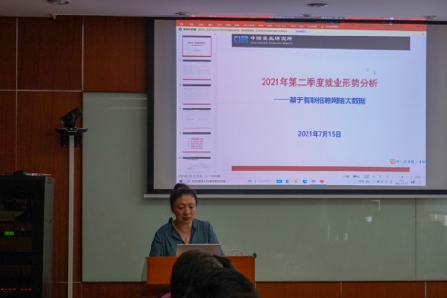 在主题报告阶段,耿林研究员作了题为《2021年第二季度就业形势分析——基于智联招聘网络大数据》的主题报告。报告首先对2021年第二季度的就业市场总体情况进行介绍,预测了2021第三季度的就业形势,随后进一步就不同行业及职业、不同行政区域及不同等级城市、不同企业规模和不同企业性质的就业景气程度进行了深入分析。报告指出,2021年第二季度就业景气指数(CIER指数)的季度指标上升至2.09,高于上季度的1.66和去年同期的1.35。从CIER指数的月度指标来看,2021年4月份需求同比大幅度上升21.08%,供给同比下降31.70%,CIER指数同比上升;5月份需求同比增加13.00%,供给同比下降30.19%,CIER指数同比上升;6月份需求人数基本不变,供给同比下降22.40%,CIER同比上升。综合三个月来看,一季度CIER指数环比、同比均上升。