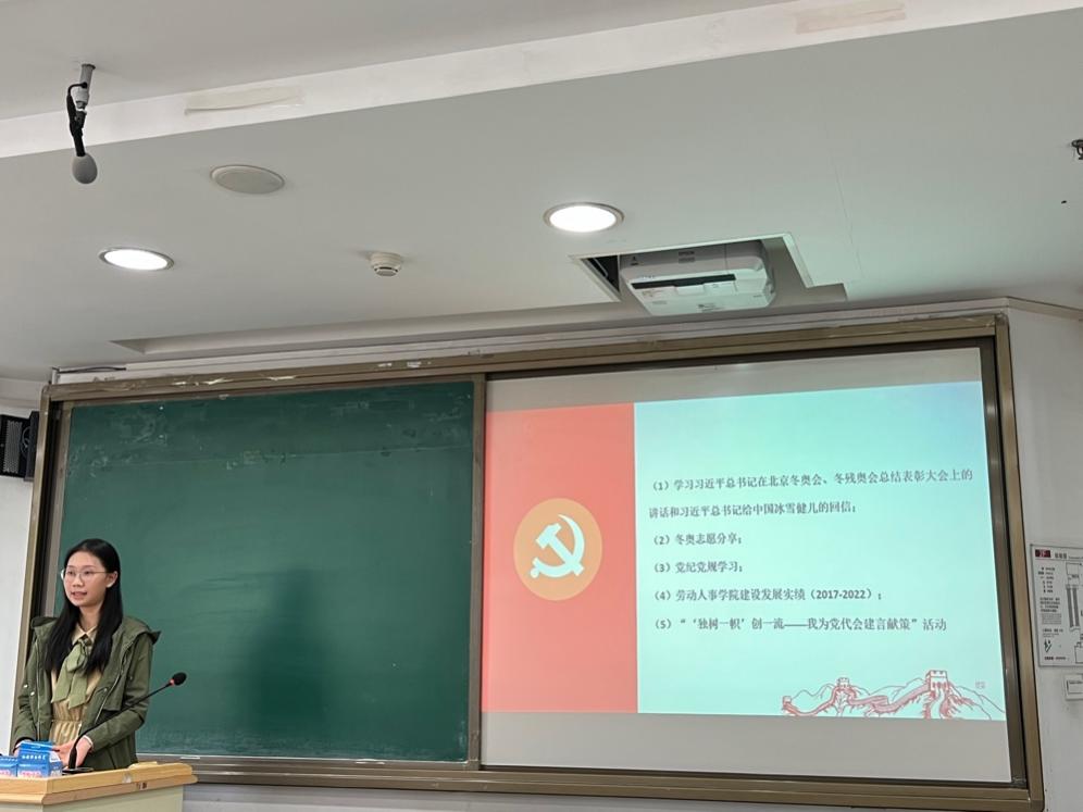 在冬奥志愿分享模块,支部党员黄睿同志和徐莹同志先后展示了冬奥期间担任志愿者的工作情况。两位同志精心准备,图文并茂地向大家分享了平凡而伟大的志愿服务经历,赢得与会同志的阵阵掌声。两位同志发挥先锋模范作用,用实际行动展现了当代中国青年的历史担当。