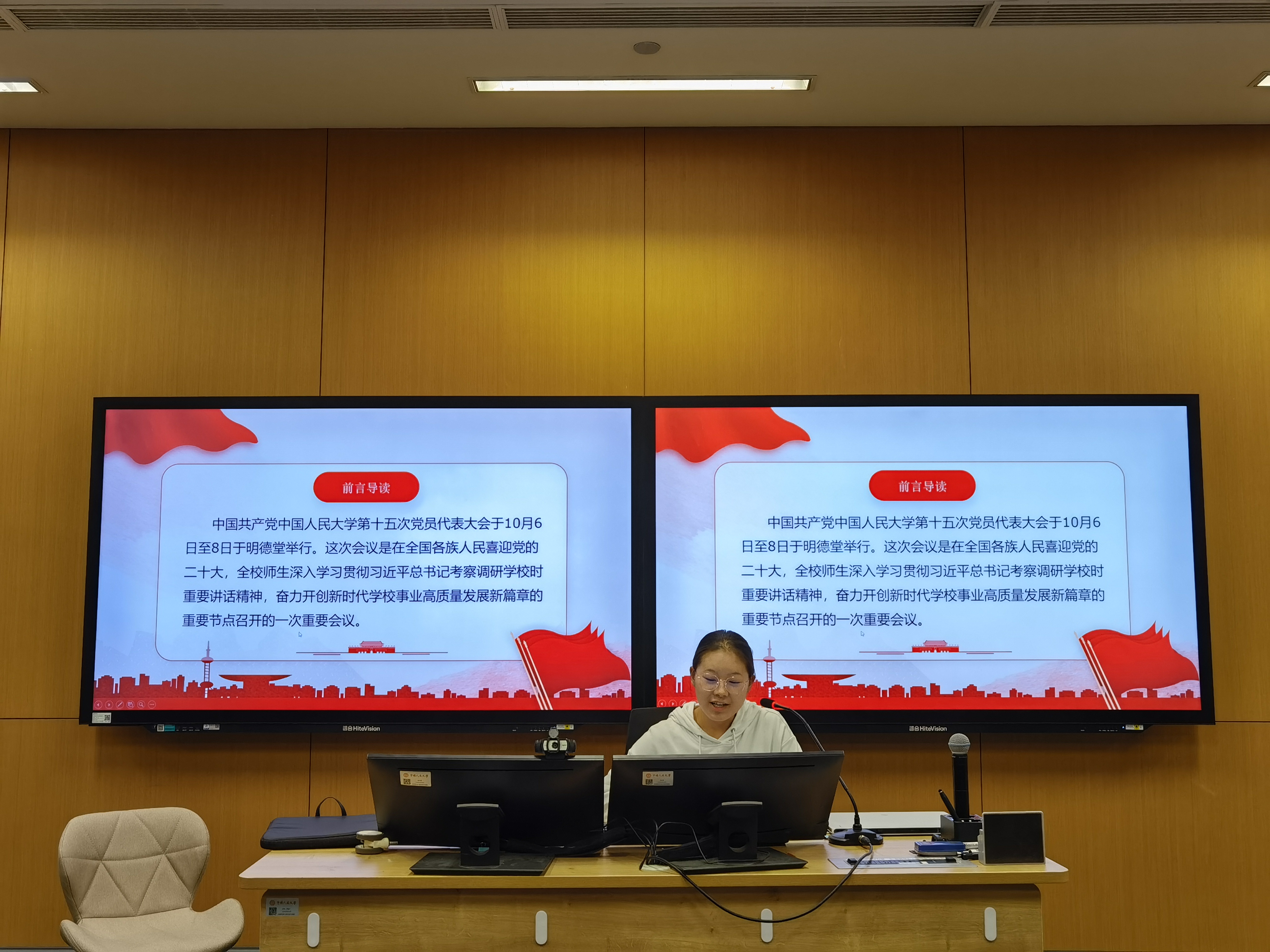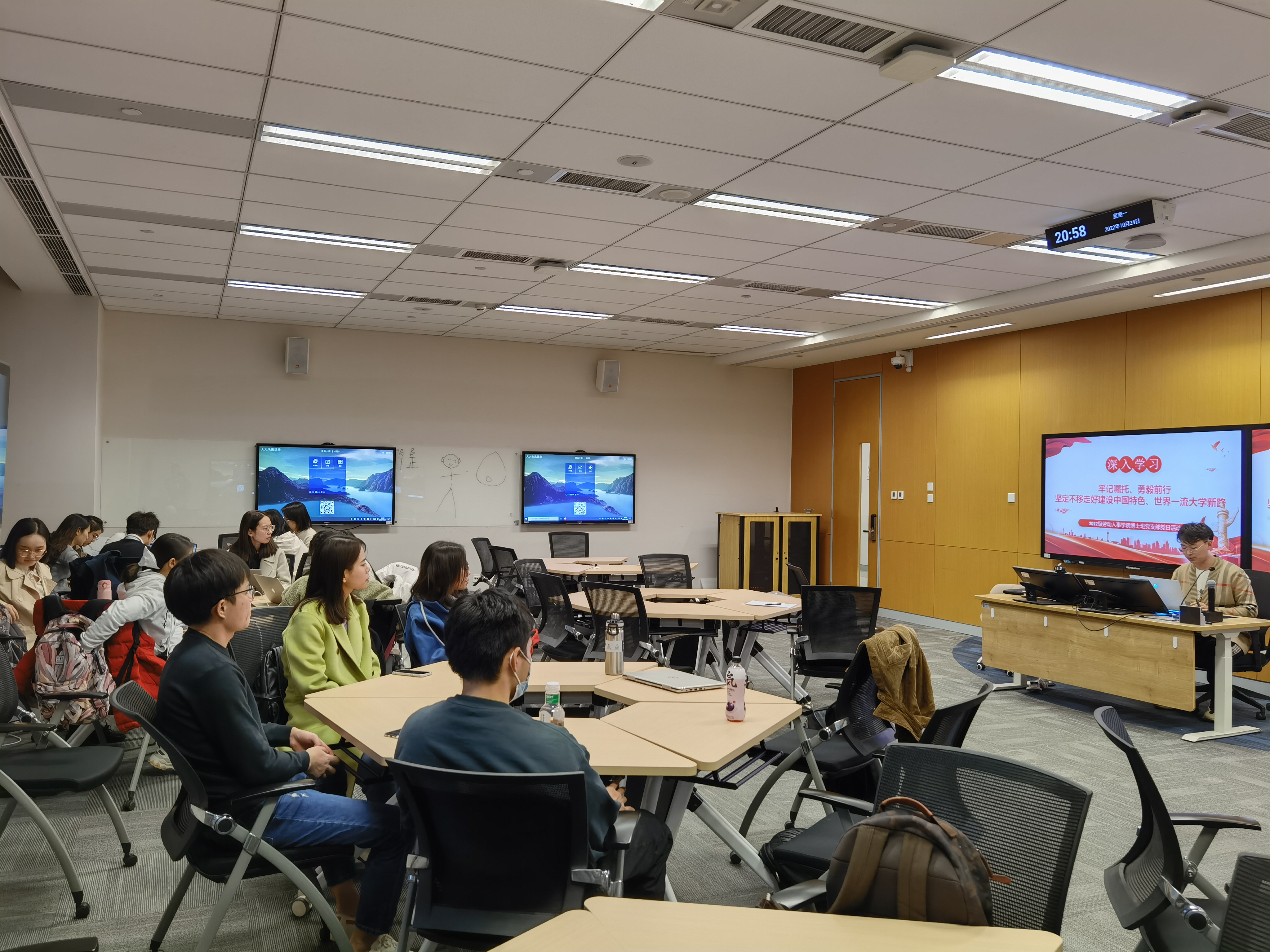 2022年10月24日晚,2022级博士班党支部以“深入学习领会党的二十大精神,深入学习宣传贯彻学校第十五次党代会精神”为主题,于立德楼412智慧教室开展了十月份的主题党日活动,支部全体党员、积极分子以及群众代表积极参与本次活动。