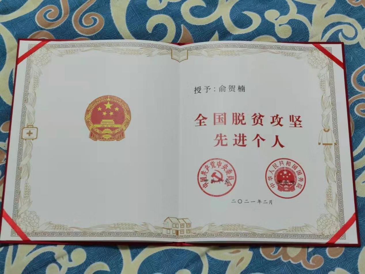 2018年9月,俞贺楠同志主动请缨到国家级贫困县、山西深度贫困县天镇薛牛坊村担任第一书记,刚驻村工作时孩子刚满2岁。两年多来,他用心凝聚人心,用情破解难题,用智导引乡亲,轻伤不下火线,带着父母驻村帮扶,使薛牛坊村贫困发生率由2018年的70.04%下降至0.47%,2019年11月实现整村脱贫。2020年初,母亲确诊为晚期肺癌脑转移,父亲患脑梗塞14年,作为独生子的他把父母从老家辽宁沈阳接回天镇,继续驻村工作。2020年9月,母亲因病去世,带着父亲继续扶贫。驻村已满2年,继续奋战在脱贫攻坚一线,带领村党支部谋划乡村振兴发展之路。10月,被国务院扶贫开发领导小组授予“全国脱贫攻坚奖贡献奖”。12月,作为候选人参加“感动中国2020人物”评选活动。2021年2月,被党中央、国务院授予“全国脱贫攻坚先进个人”。