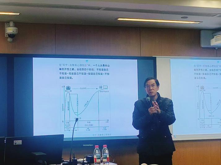 分享中,周石老师重点强调 “持续努力、德才兼备、坚守原则底线” 的重要性,特别叮嘱校友们 “要坚持每日锻炼一小时,主动学习营养健康知识,以强健体魄和饱满精神应对职业与生活挑战”。此外,他还结合 “邓宁 - 克鲁格心理效应”,解读个人认知从 “愚昧山峰” 到 “开悟之坡” 的四个阶段,引导校友们保持谦逊学习的态度,不断提升自我认知。