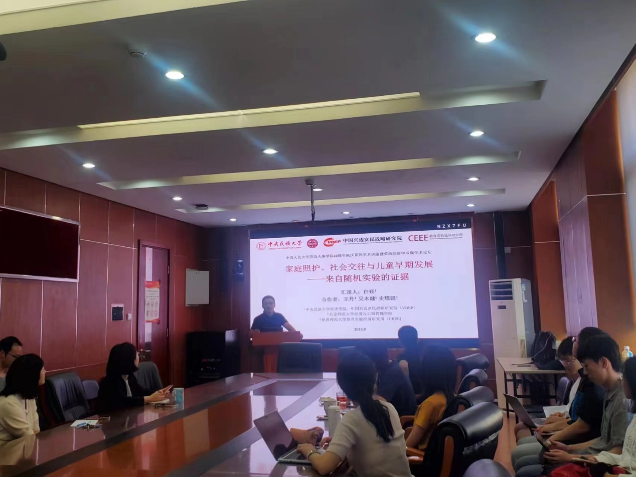 2023年9月13日下午,由硬硬av 主办,劳动经济系和中国就业研究所承办的“劳动经济学双周论坛”第194期讲座在求是楼347会议室成功举办。来自中央民族大学的白钰教授分享了主题为“家庭照护、社会交往与农村婴幼儿早期发展——来自随机干预实验的证据”的研究。本次论坛由硬硬av 邹先强讲师主持,硬硬av 赵丽秋教授、翁茜副教授、雷子腾讲师、林琳讲师、陈泽阳讲师,以及其他校内外师生参与了此次讲座。