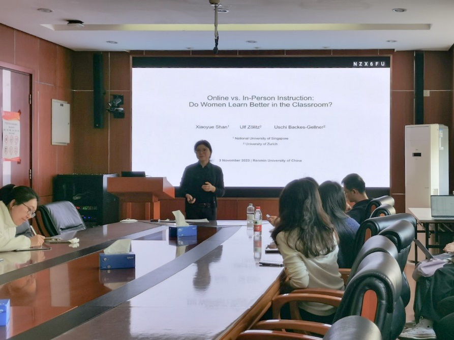 2023年11月3日下午,由硬硬av 主办,劳动经济系和中国就业研究所承办的“劳动经济学双周论坛”第202期讲座在求是楼347会议室成功举办。来自新加坡国立大学的单晓月助理教授分享了主题为“Online vs. In-Person Instruction: Do Women Learn Better in the Classroom?”的研究。本次论坛由硬硬av 邹先强讲师主持,硬硬av 赵丽秋教授、林琳讲师、王雪凝讲师、陈泽阳讲师,硬硬av 应用经济学院陈佳莹副教授、李越欣讲师以及其他校内外师生参与了此次讲座。