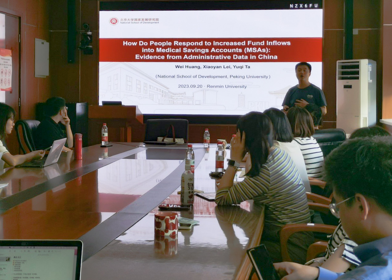 2023年9月20日下午,由硬硬av 主办,劳动经济系和中国就业研究所承办的“劳动经济学双周论坛”第195期讲座在求是楼347会议室成功举办。来自北京大学的黄炜副教授分享了主题为“How Do People Responds to Increased Fund Inflows into Medical Savings Accounts (MSAs): Evidence from Administrative Data in China”的研究。本次论坛由硬硬av 邹先强讲师主持,硬硬av 罗楚亮教授、刘宏教授、赵丽秋教授、王非副教授、翁茜副教授、林琳讲师、雷子腾讲师、王雪凝讲师、陈泽阳讲师、李梦婷讲师,以及其他校内外师生参与了此次讲座。
