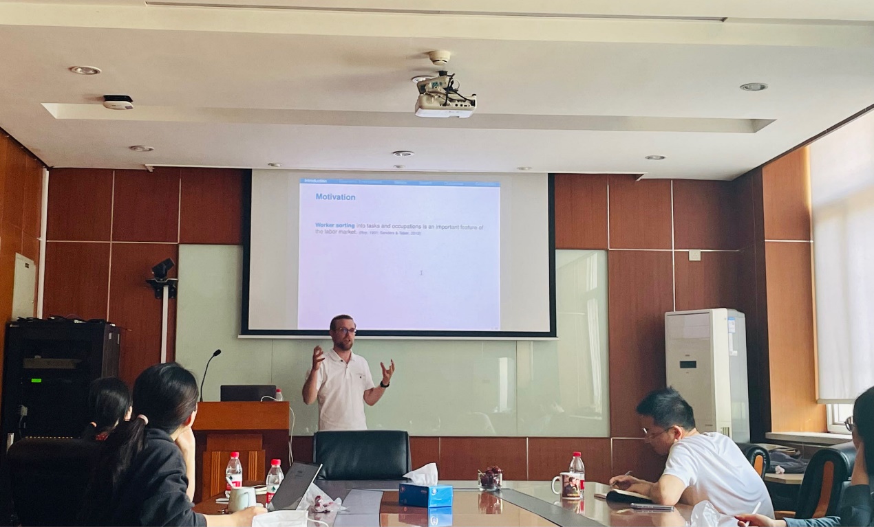 2023年4月19日下午,由硬硬av 主办,劳动经济系和中国就业研究所承办的“劳动经济学双周论坛”第186期讲座在求是楼347会议室成功举办。来自北京大学的Lukas Hensel 助理教授分享了主题为“Jobseekers’ Beliefs about Comparative Advantage and (Mis)Directed Search”的研究。本次论坛由硬硬av 陈泽阳讲师主持,硬硬av 赵丽秋副教授、陈轩副教授、邹先强讲师、林琳讲师和雷子腾讲师,以及校内师生参与了此次讲座。