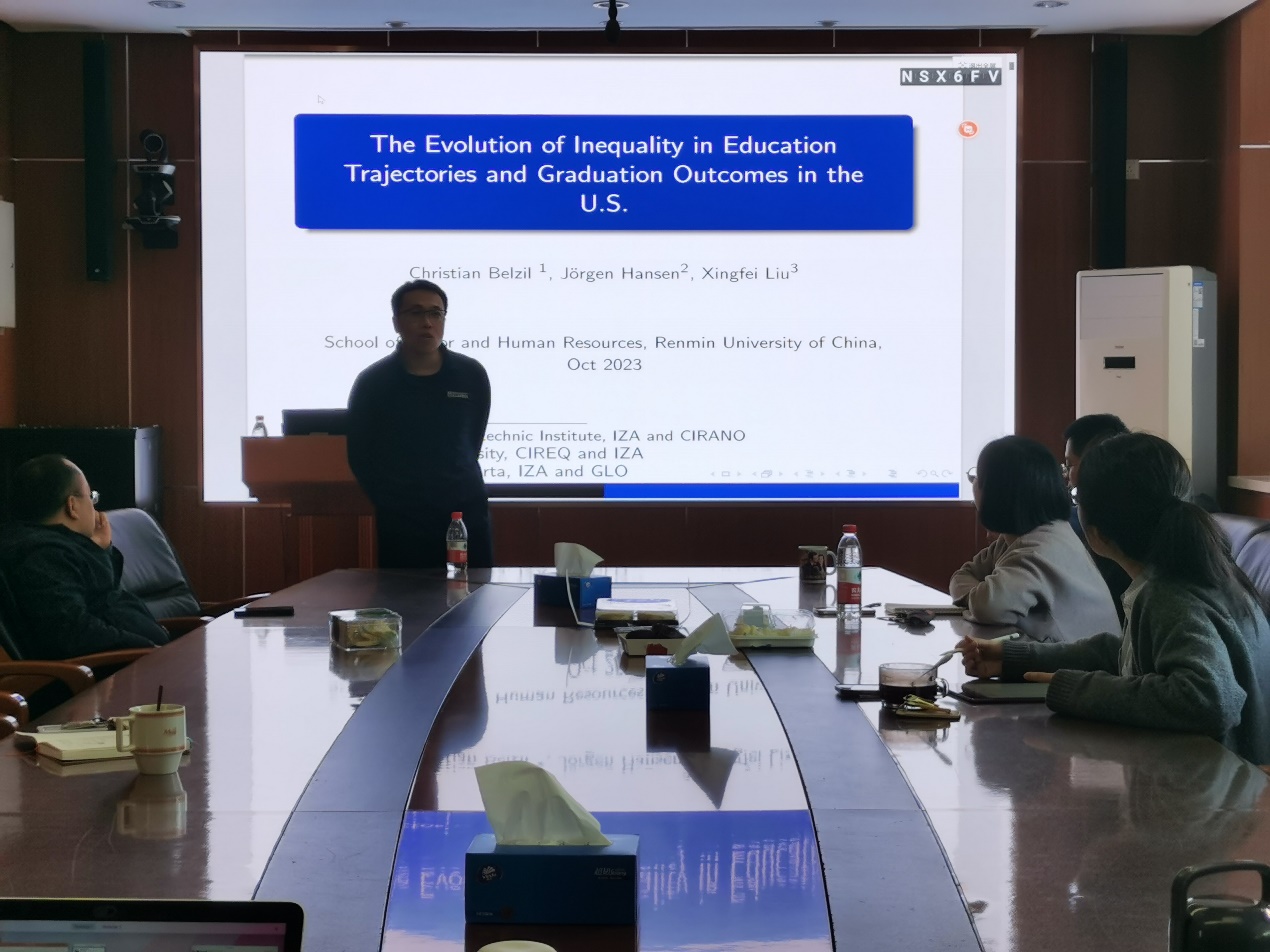 2023年10月26日下午,由硬硬av 主办,劳动经济系和中国就业研究所承办的“劳动经济学双周论坛”第200期讲座在求是楼347会议室成功举办。来自加拿大阿尔伯塔大学的刘兴飞副教授分享了主题为“The Evolution of Inequality in Education Trajectories and Graduation Outcomes in the U.S.”的研究。本次论坛由硬硬av 赵丽秋教授主持,硬硬av 赵忠教授、罗楚亮教授、邹先强讲师、林琳讲师、王雪凝讲师、雷子腾讲师、陈泽阳讲师,硬硬av 经济学院乔雪教授以及其他校内外师生参与了此次讲座。