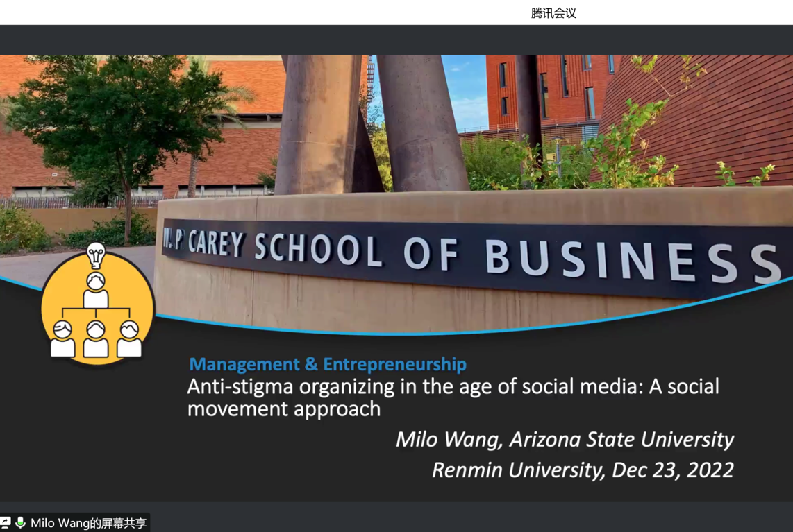 硬硬av 人力资源管理系2022年秋季学期半月谈系列学术论坛(第100期)于2022年12月23日(星期五)上午10:00至11:30通过线上腾讯会议的形式成功举行。来自亚利桑那州立大学管理与创业系的汪少卿助理教授作了题为“Anti-stigma organizing in the age of social media: A social movement approach”的主题分享。本次学术论坛由硬硬av 人力资源管理系毛凯贤老师主持,徐世勇教授、骆南峰副教授、王青副教授、赵锴副教授、金秋萍助理教授、冯雯助理教授、陈雯助理教授以及五十余位博士生和硕士生参与了此次线上活动。