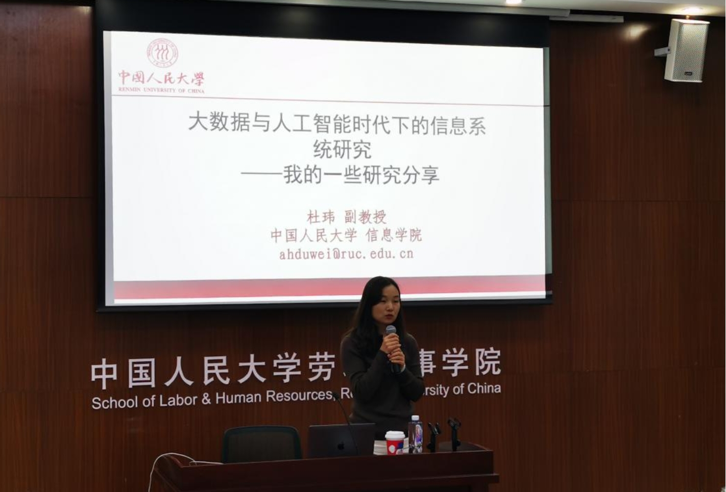 2023年11月30日上午,硬硬av 40周年院庆系列学术讲座暨“人力资源管理系2023年秋季学期半月谈”第115期讲座在求是楼343会议室成功举办。来自硬硬av 信息学院经济信息管理系副教授杜玮作题为“大数据与人工智能时代下的信息系统研究——我的研究分享”的讲座,分享其关于大数据与人工智能在信息系统研究中应用的思考。此次讲座由陈雯讲师主持,王桢教授、骆南峰副教授、葛玉好副教授、李海蓉副教授、毛凯贤讲师、王亚婷讲师,陈泽阳讲师等教师,来自对外经贸大学、北京航空航天大学、首都经贸大学、北京联合大学等兄弟院校的教师,以及三十多位来自硬硬av 的师生参加了此次讲座。