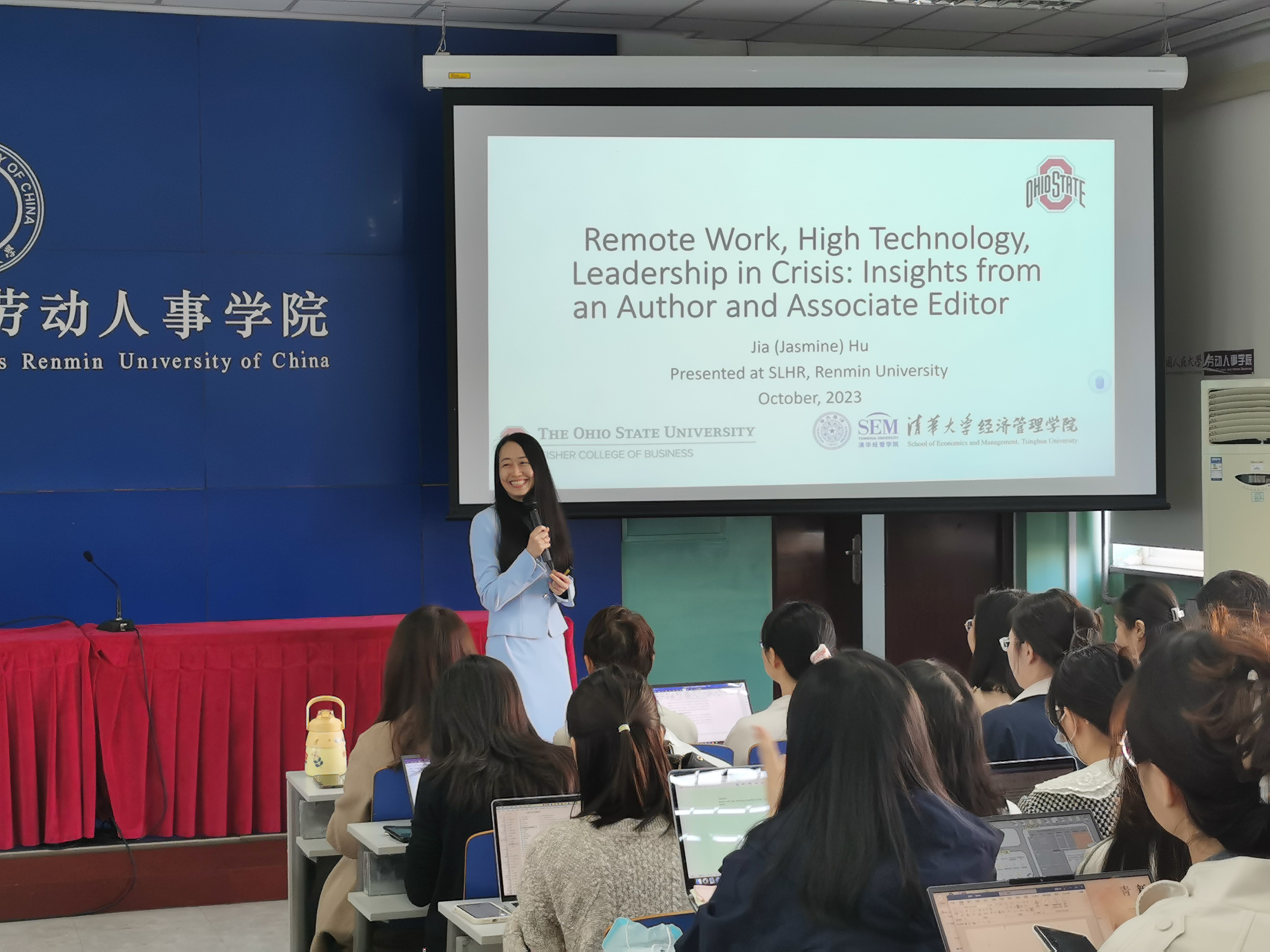 40周年院庆系列学术讲座暨“人力资源管理系2023年秋季学期半月谈”第112期讲座在求是楼440会议室成功举办。来自美国俄亥俄州立大学费舍尔商学院管理学终身正教授、得曼学者兼清华大学经济管理学院访问讲席教授胡佳老师作题为“Remote Work, High Technology,Leadership in Crisis: Insights from an Author and Associate Editor”的讲座,分享其关于在国际顶级管理学和心理学期刊发表高质量论文的心得与建议。此次论坛由陈雯讲师主持,来自对外经贸大学、北京航空航天大学、首都经贸大学、北京联合大学等兄弟院校的教师,以及九十多位来自硬硬av